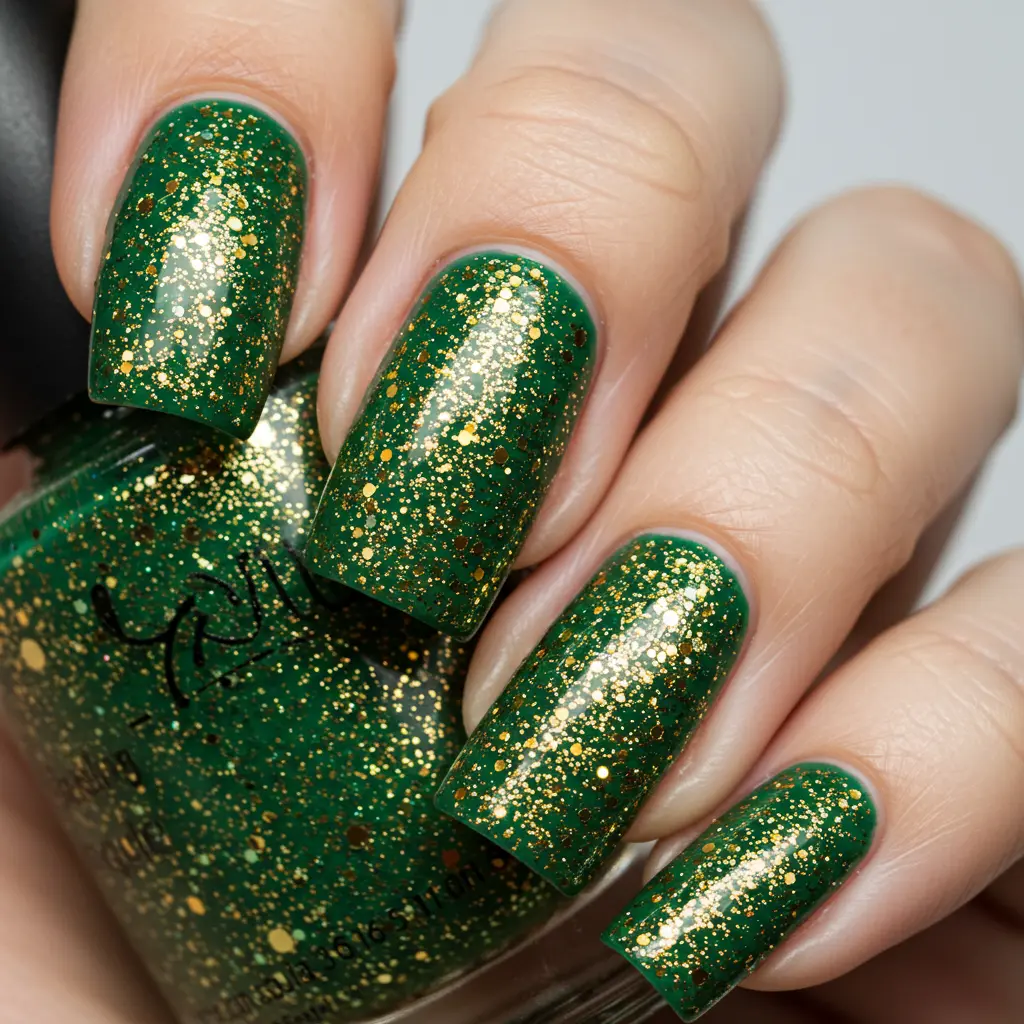 Gold glitter polish adds a magical sparkle to your St. Patrick’s Day manicure. Apply it as a full coat or as an ombre effect over green nails.