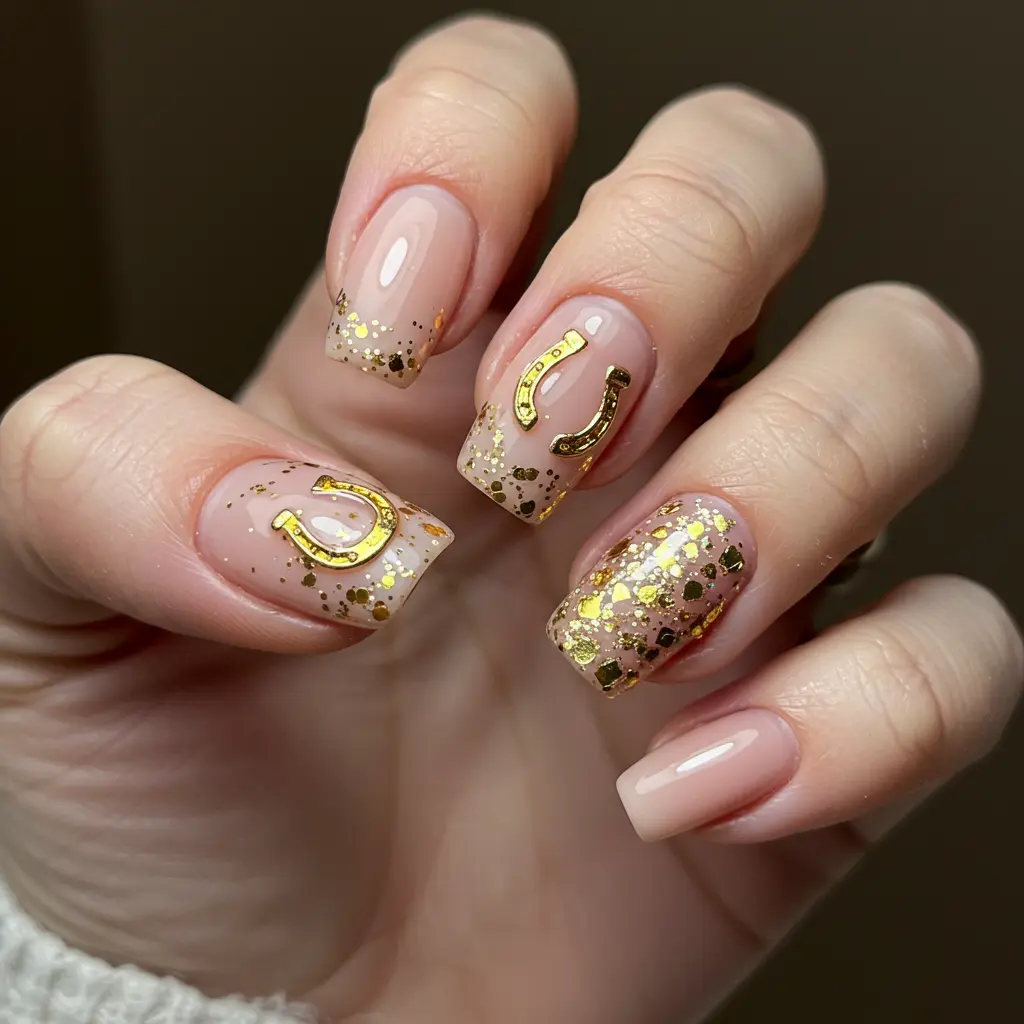 Incorporate small gold horseshoe designs on an accent nail to bring some extra luck.