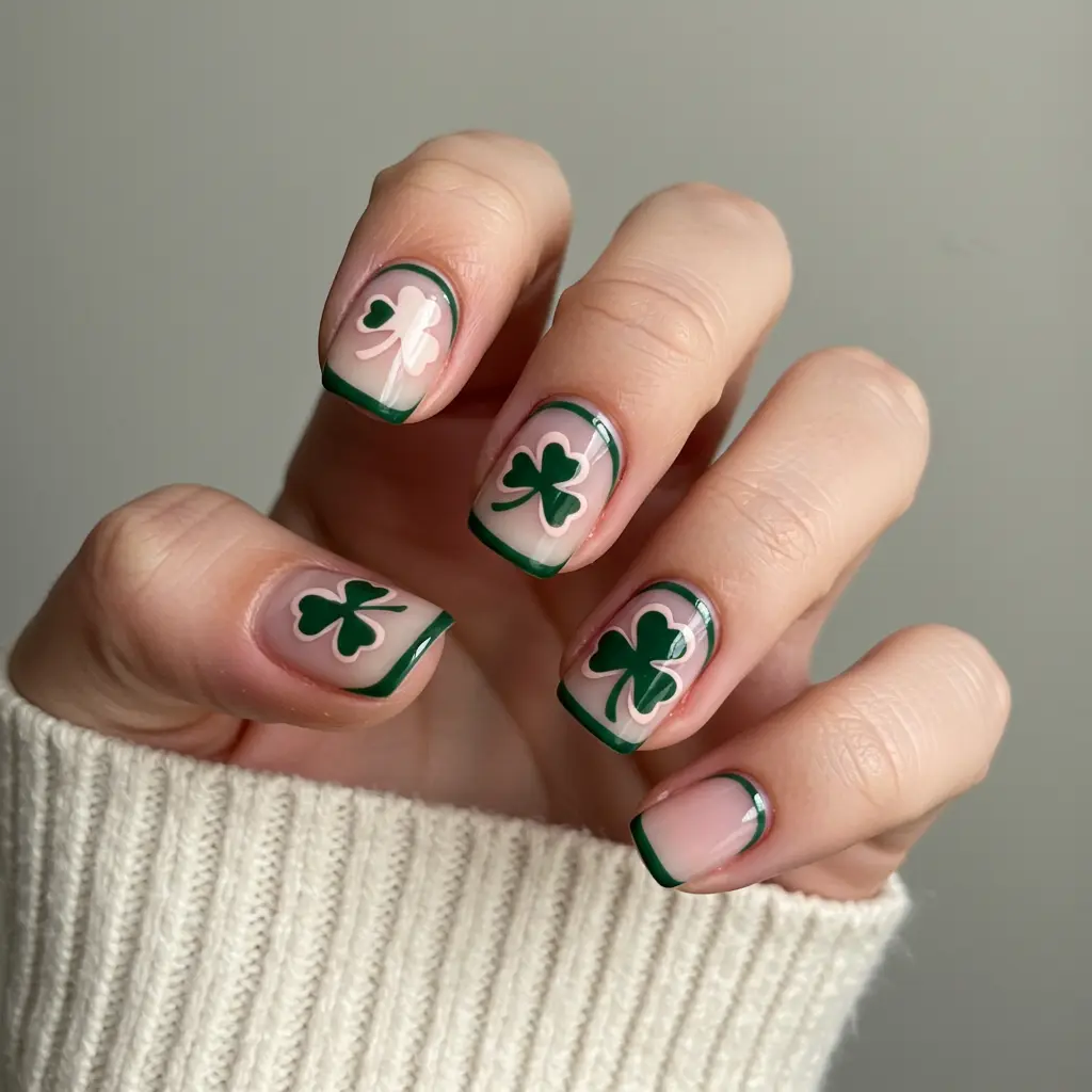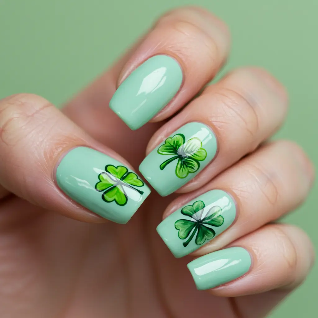 Add a touch of luck with tiny shamrock designs on one or two accent nails. Use a fine brush or nail stickers for a clean look.
