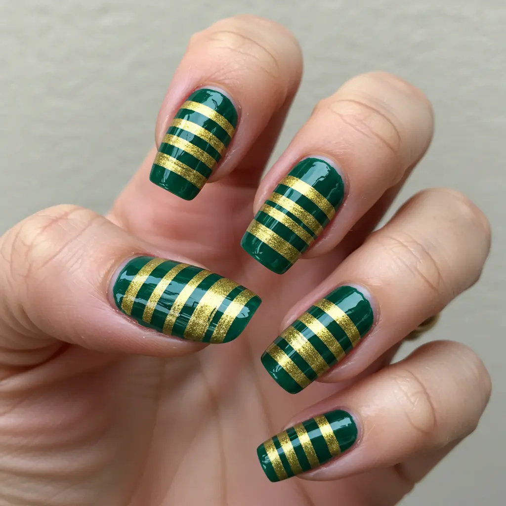 19. Striped Green and Gold Nails