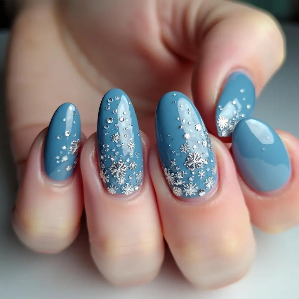 Frozen blue nails with small diamond-shaped accents give a sleek and stylish look. The geometric shapes bring a modern twist to the icy blue color, making it a trendy choice for the holidays.