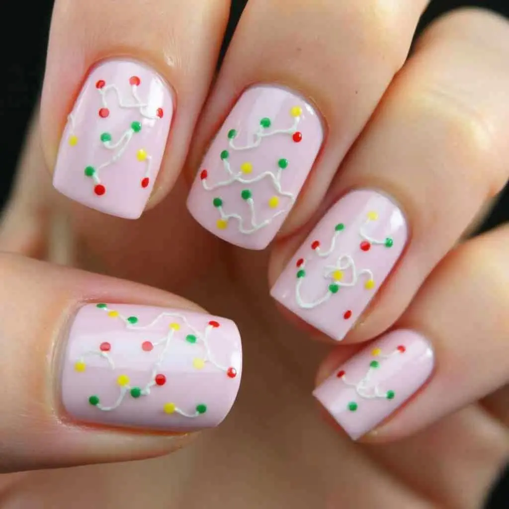Red and green are classic Christmas colors, and when paired with Christmas lights, they make a festive and bold statement. Use a dark green or red base and adorn your nails with small, colorful Christmas lights in these traditional shades.
