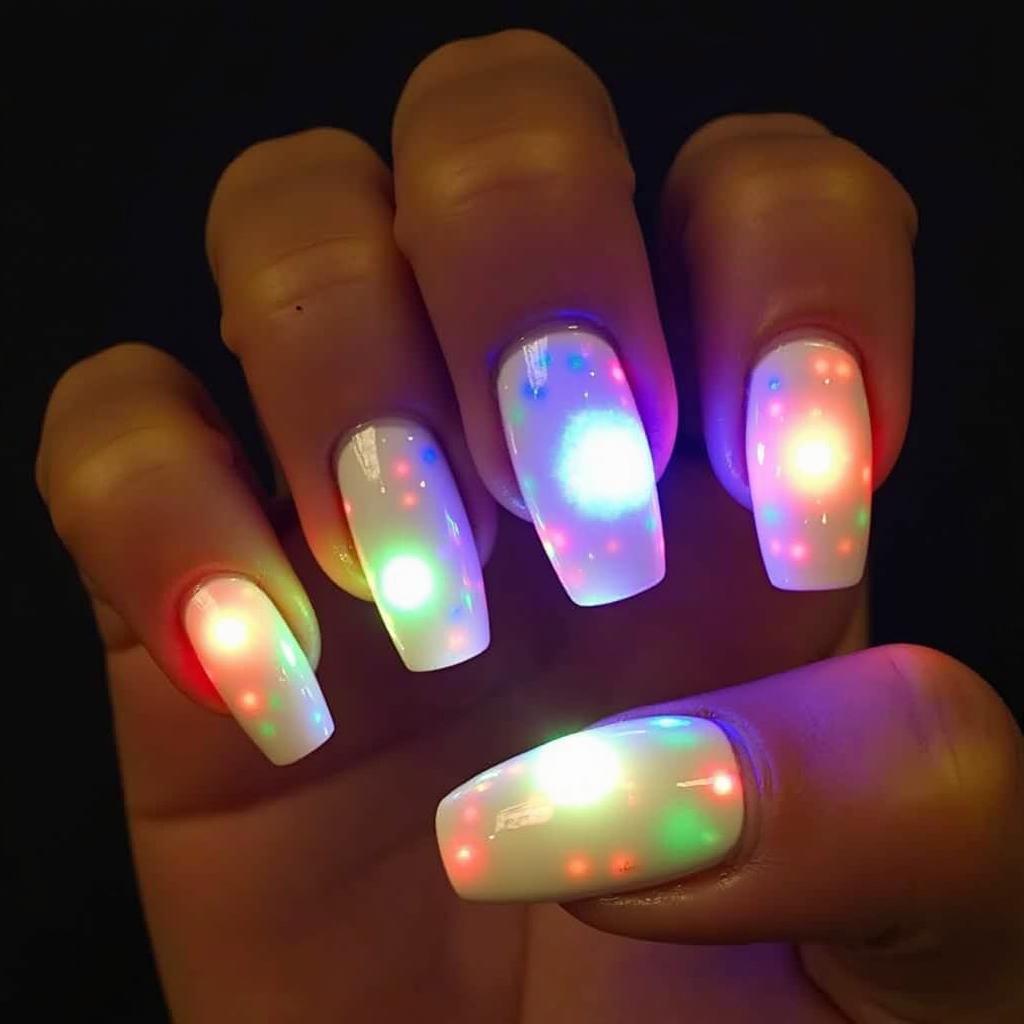 14. Neon Christmas Lights on White Nails