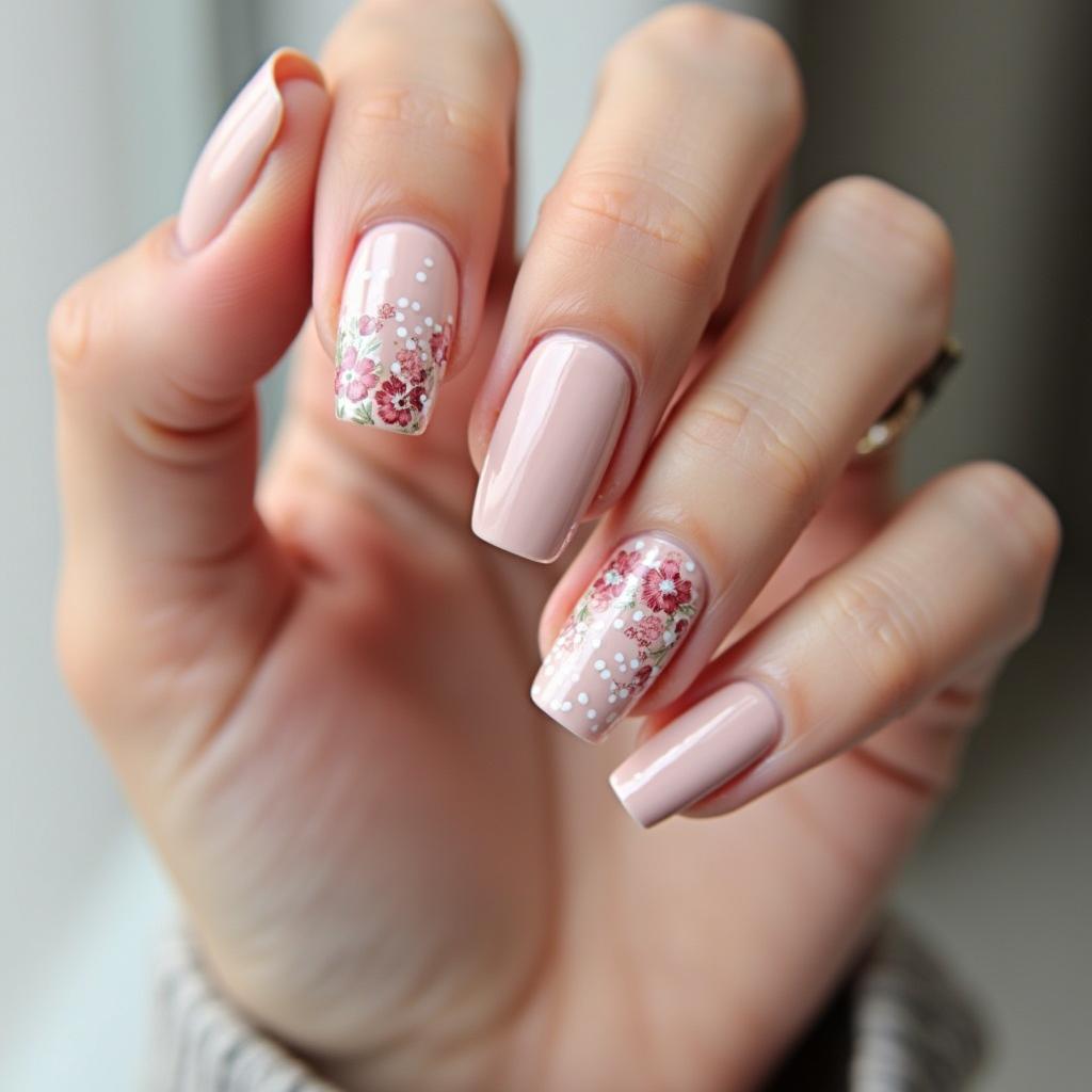 Create a soft nude base with a delicate single flower painted on one accent nail for a refined, minimalist look.