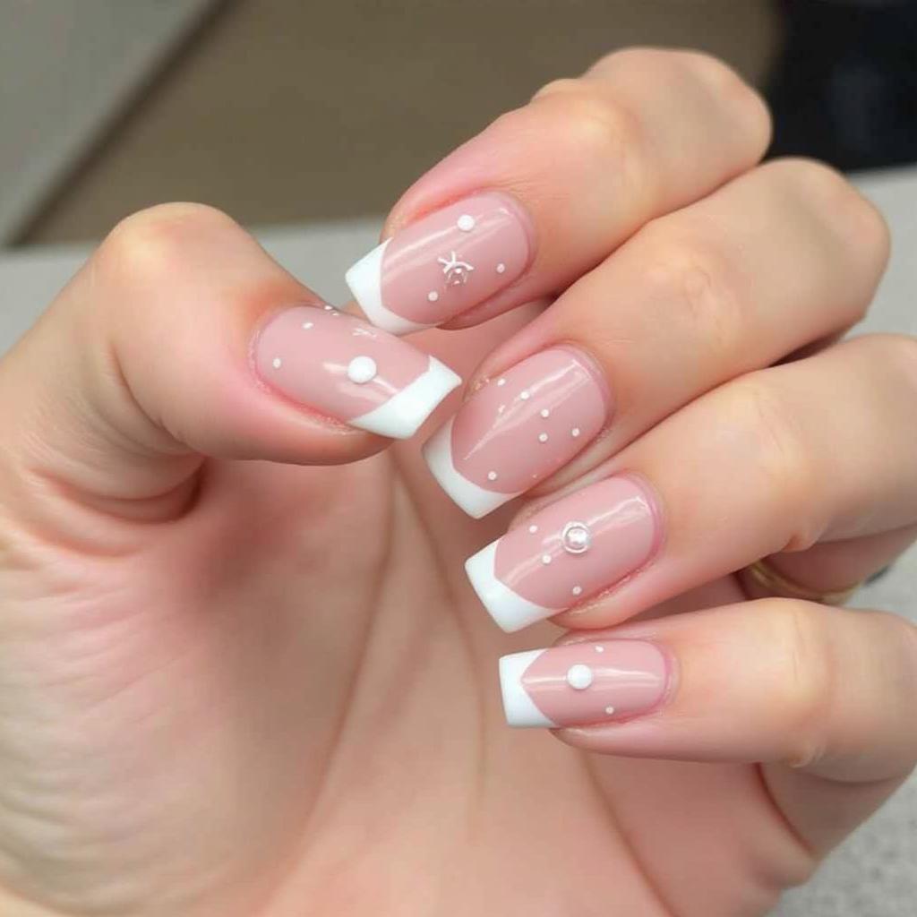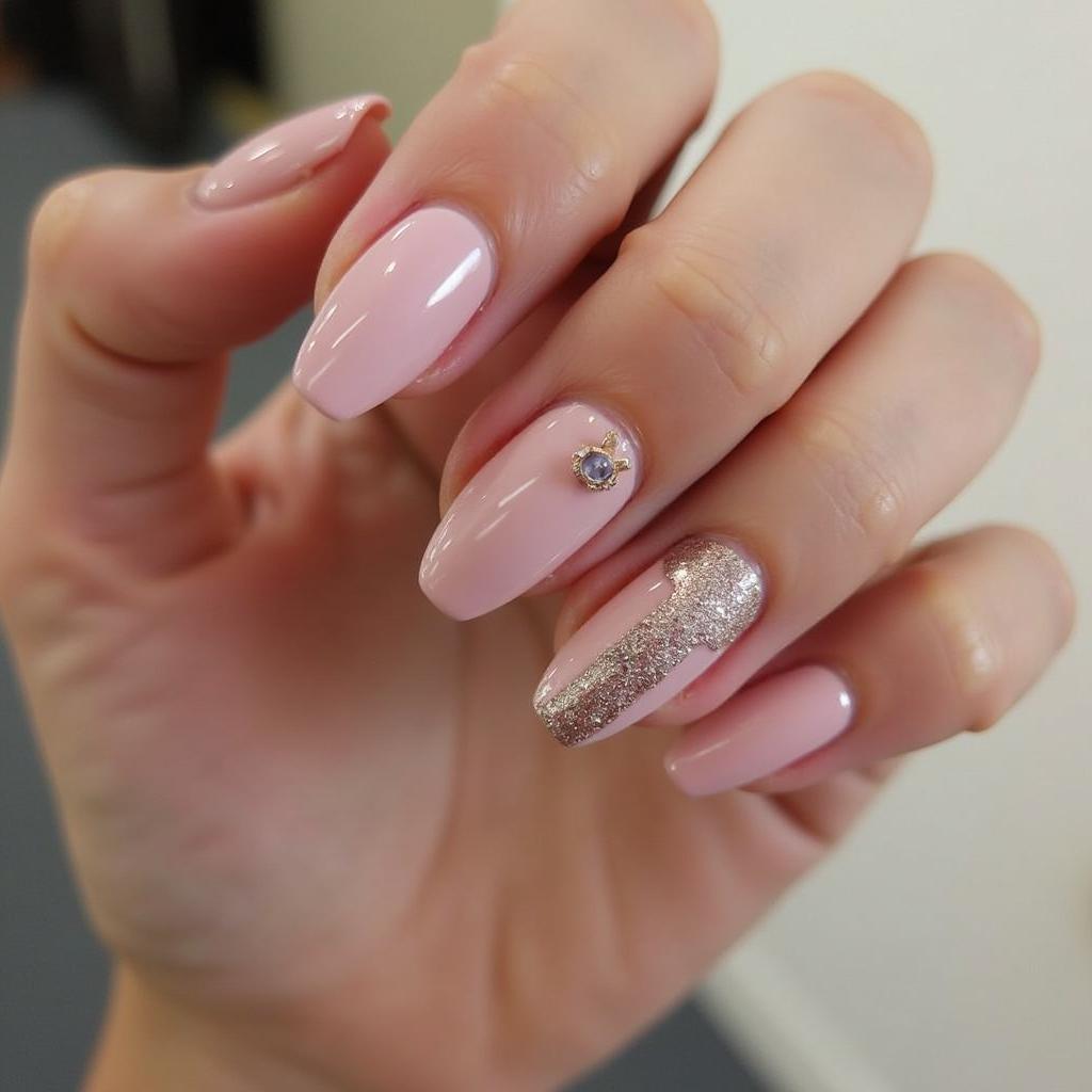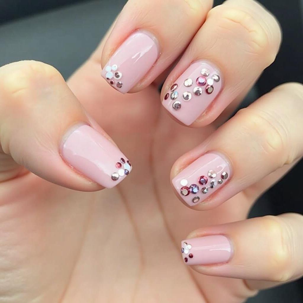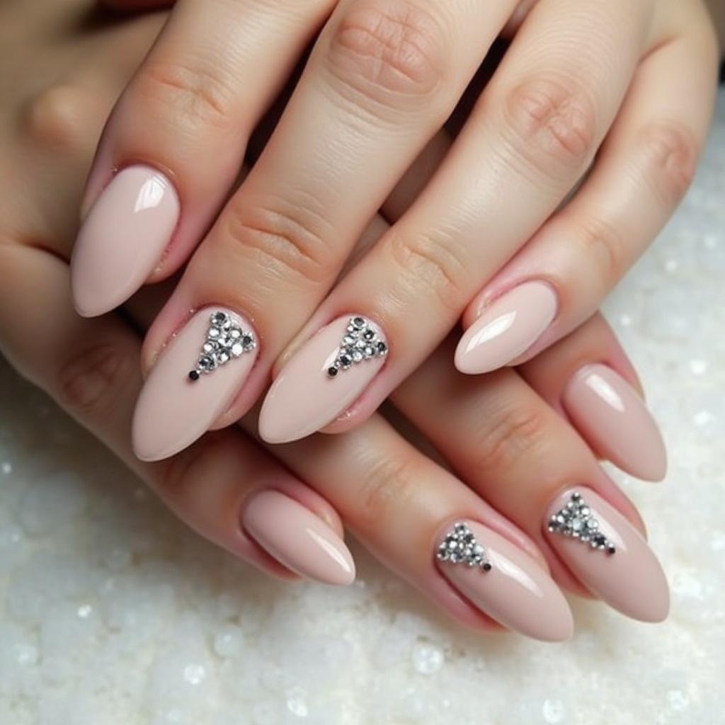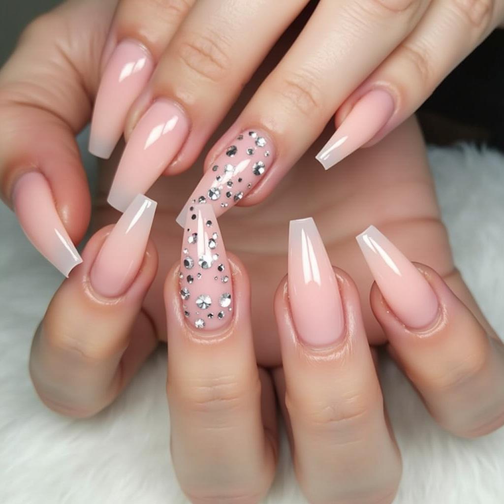 A soft nude base paired with rhinestone accents on a few nails adds a touch of sparkle and sophistication.