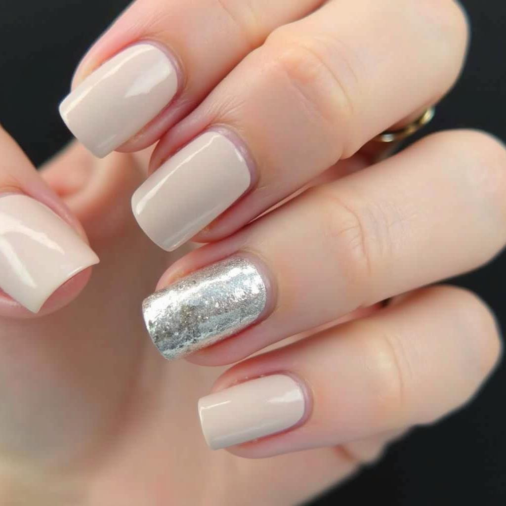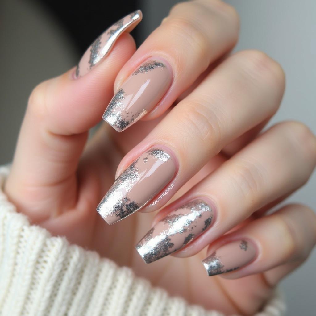 25. Elegant Nude Nails with Silver Leaf