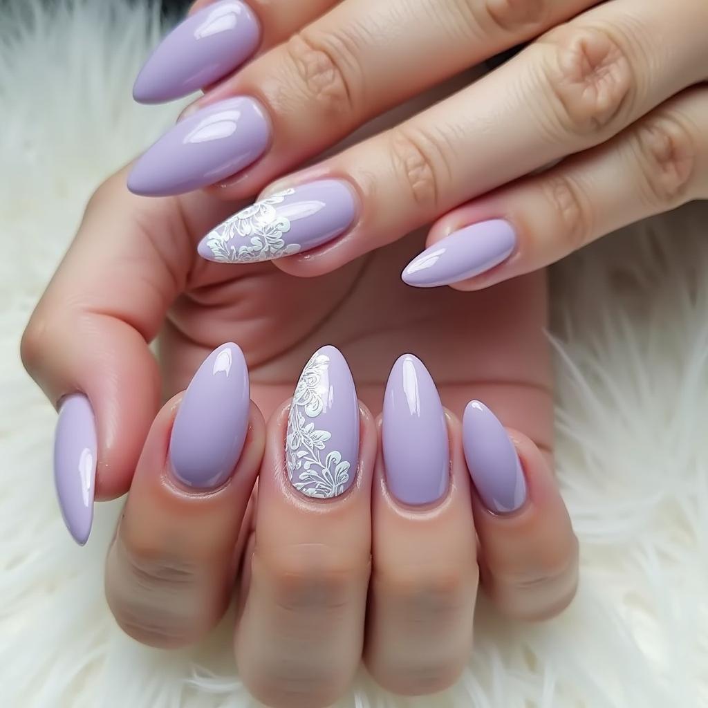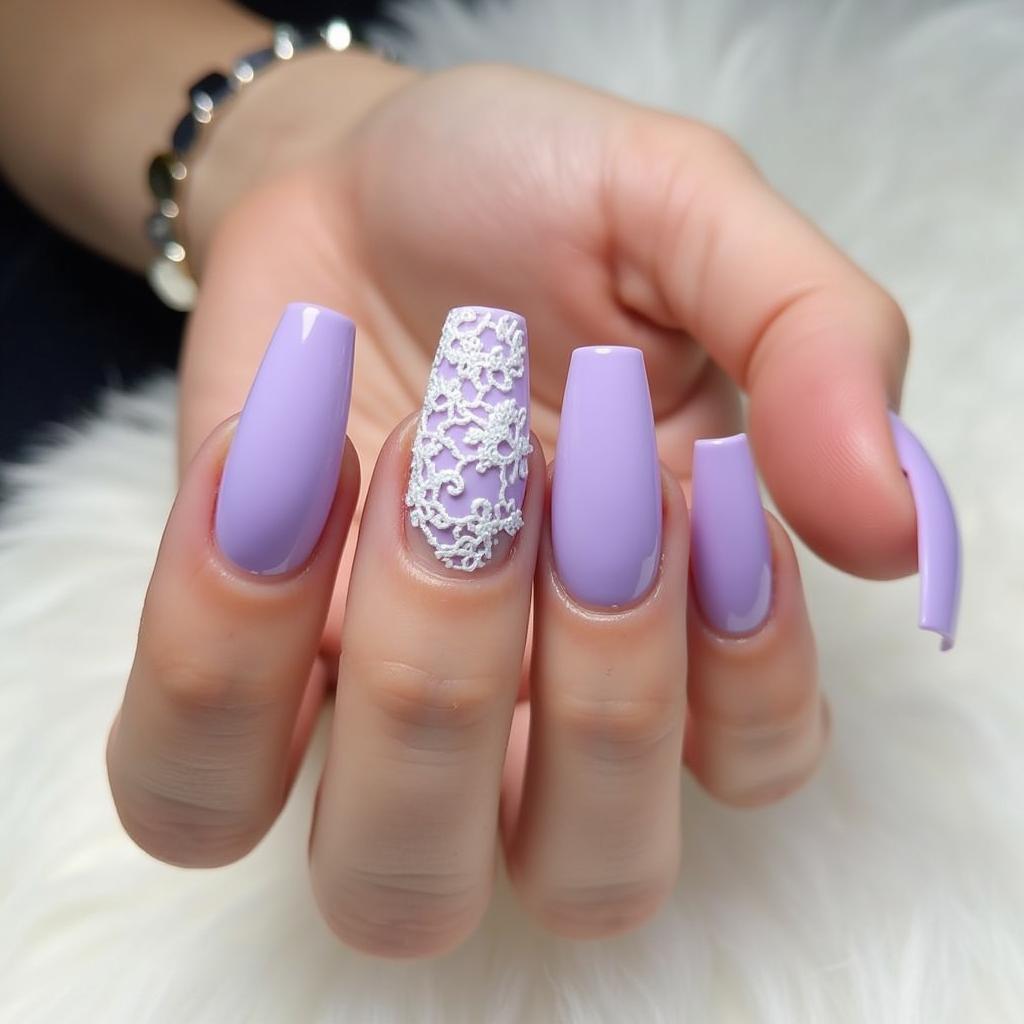 Add intricate white lace designs over a lavender base for a refined, feminine nail art look.