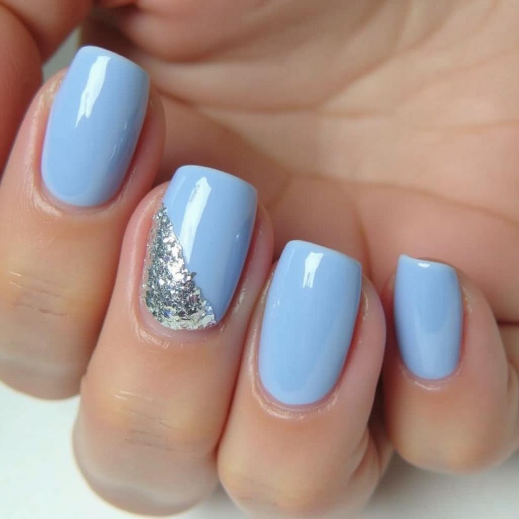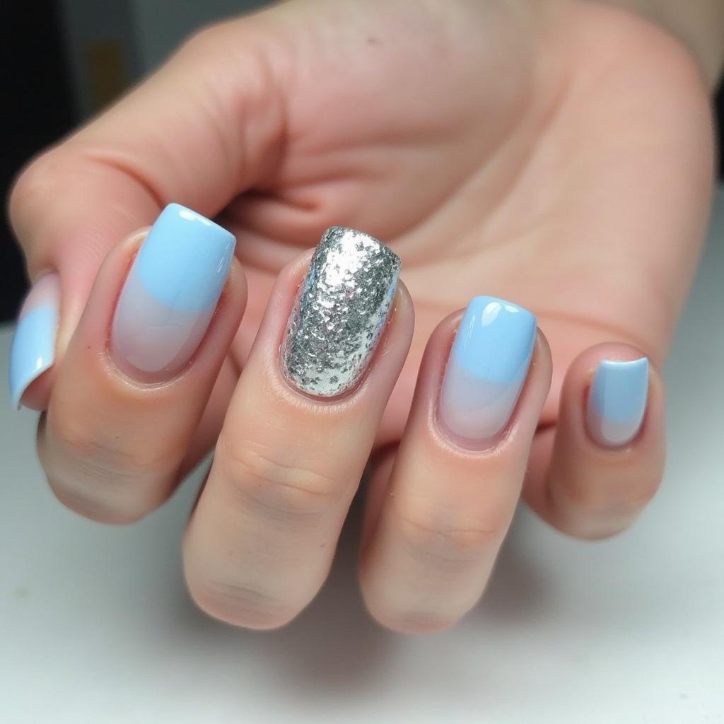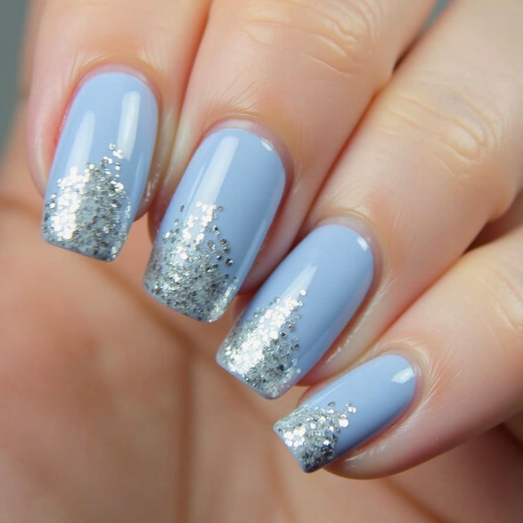 Apply silver glitter on the tips of your light blue nails for a modern, glamorous effect.