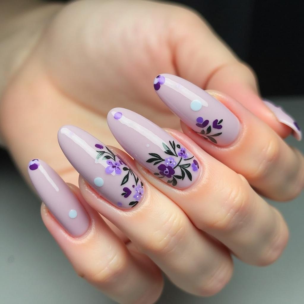 Create small purple floral accents on nude nails for a soft, spring-inspired design.