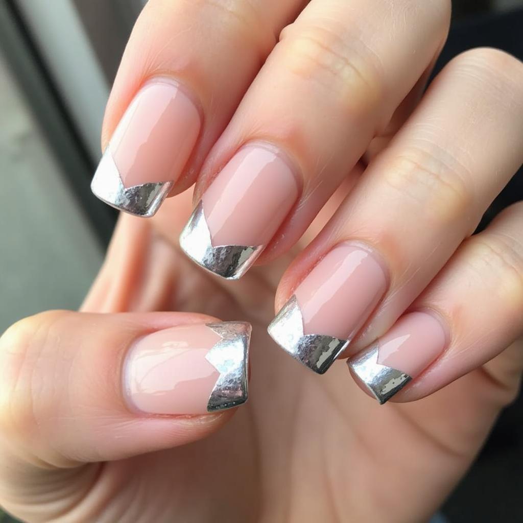 Create nude nails with silver leaf at the tips for a unique and elegant spring twist on the French manicure.