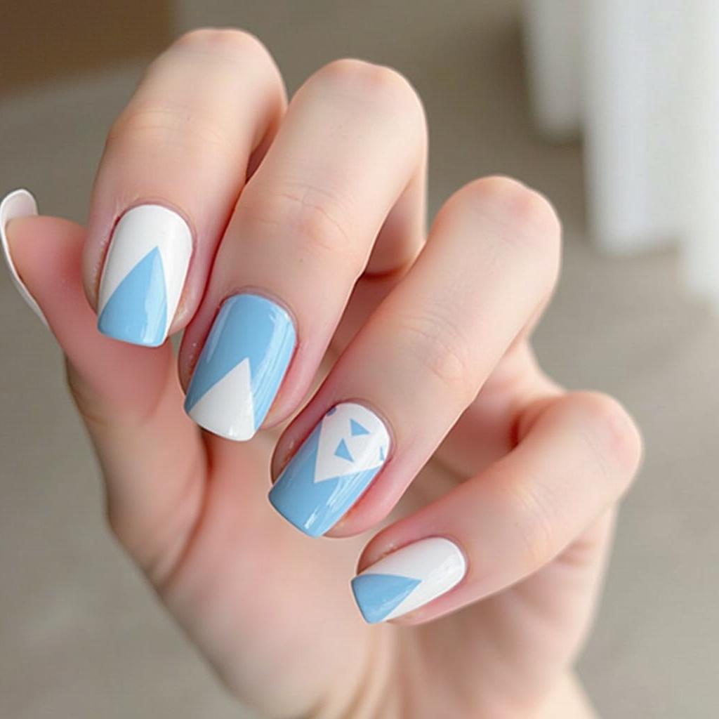 Create geometric triangles using soft blue and white for a minimalist, modern nail design.