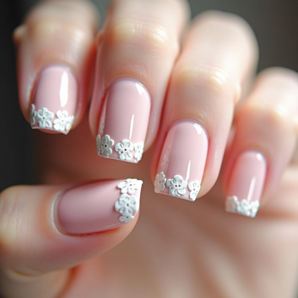 Create soft pink nails with white flowers at the tips for a delicate, spring-inspired design.