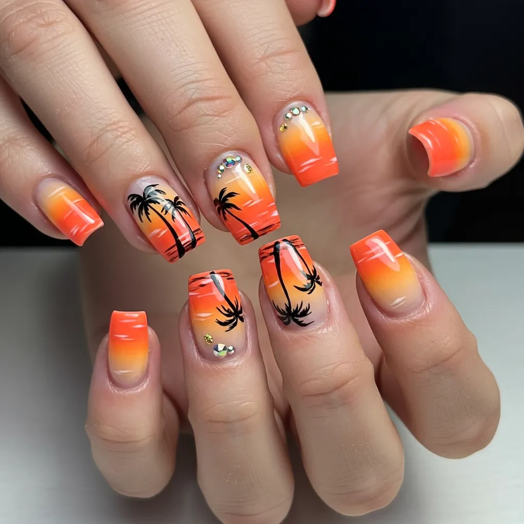 Add some sparkle to your tropical sunset nails with glittering accents.