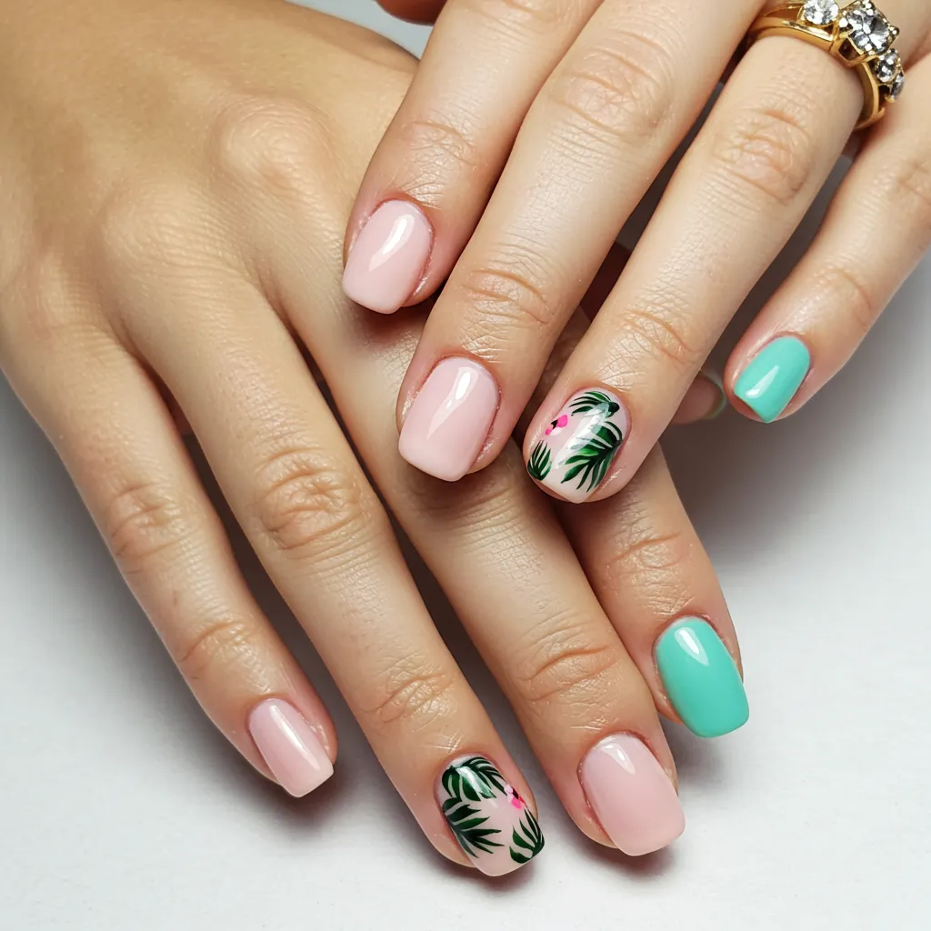 Paint a single flamingo on one accent nail surrounded by palm trees and soft sunset gradients.