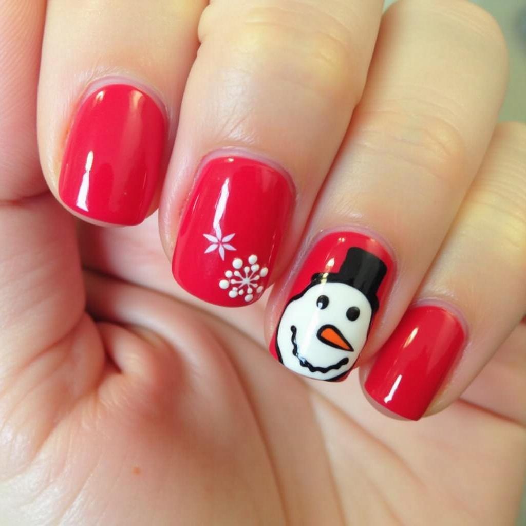 For a fun, playful holiday design, add a snowman accent to an otherwise bold red base. The snowman design brings a whimsical touch to your nails, perfect for spreading holiday cheer.