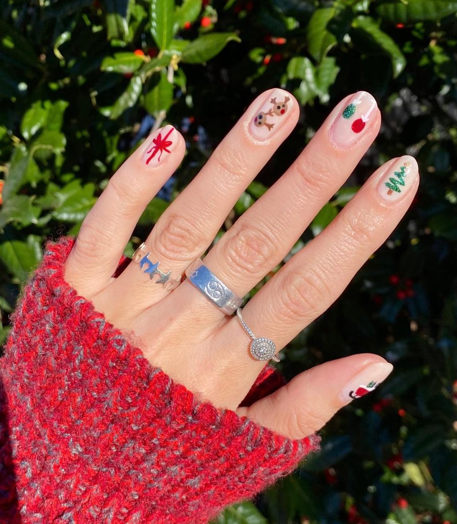 Add a small Christmas tree design to an accent nail, paired with a bold red base for a playful and festive vibe. This design is perfect for anyone who wants to add a bit of whimsy to their holiday nails.