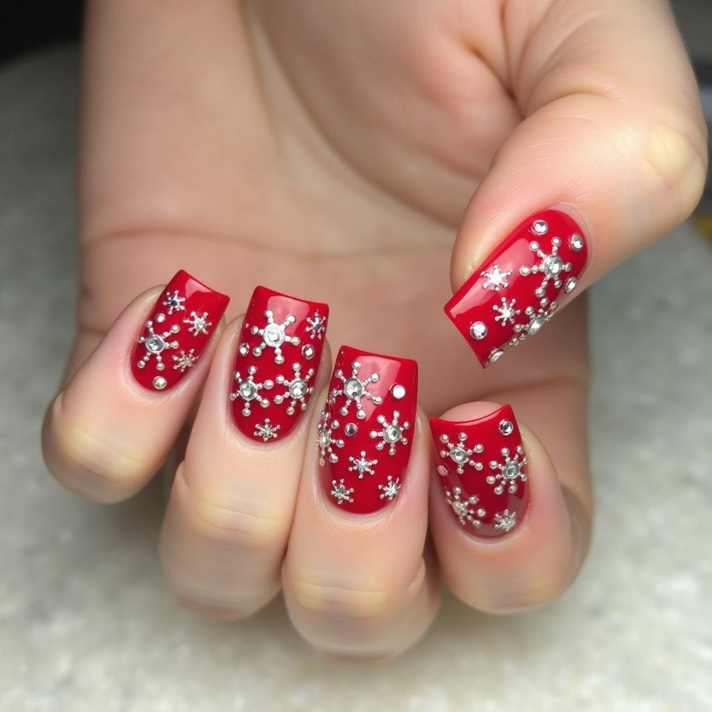 Combine red nails with intricate snowflakes and rhinestone accents for a glamorous winter design. The rhinestones add sparkle, making this look perfect for a fancy holiday gathering.