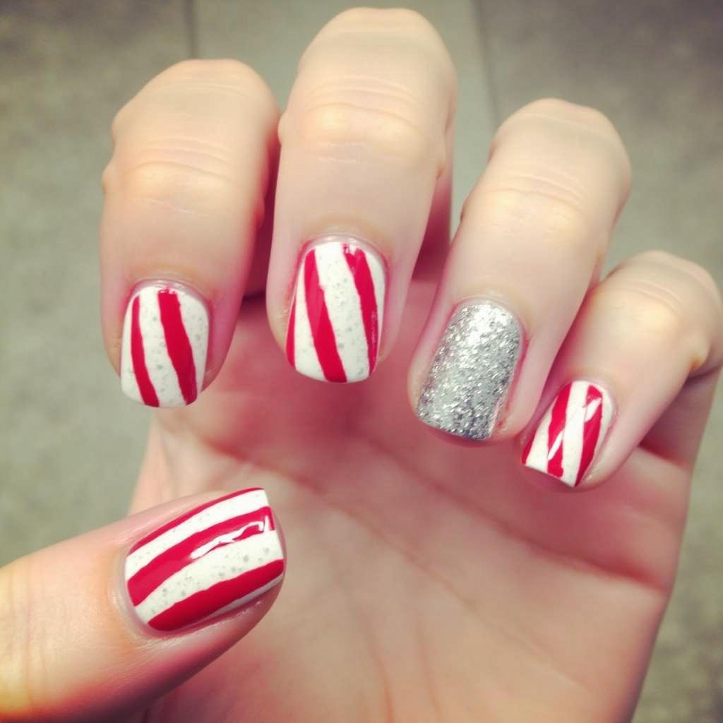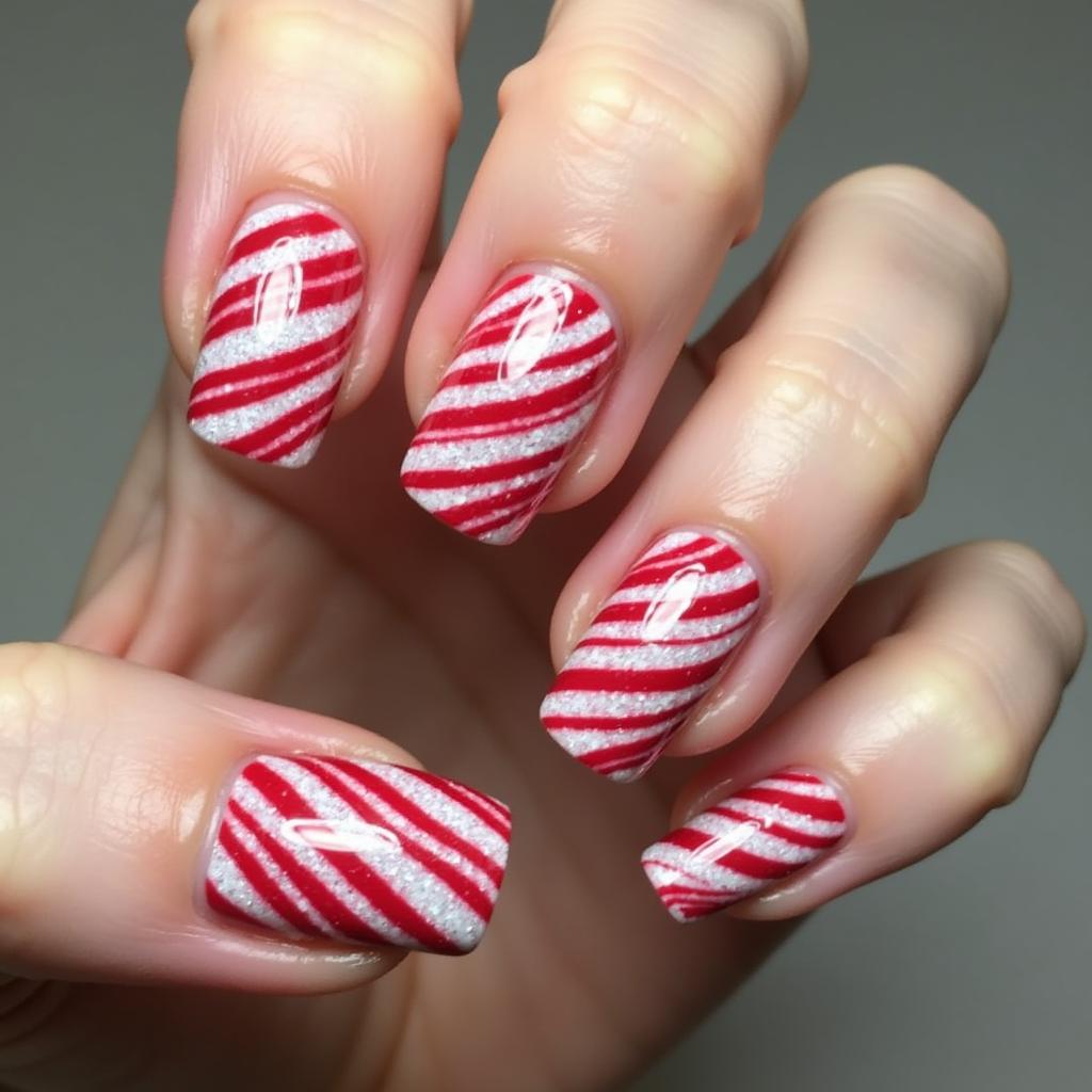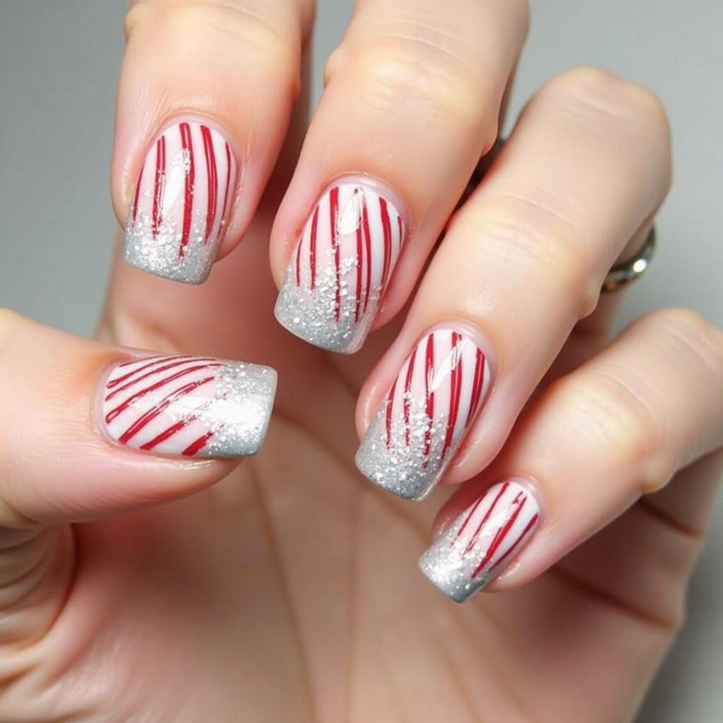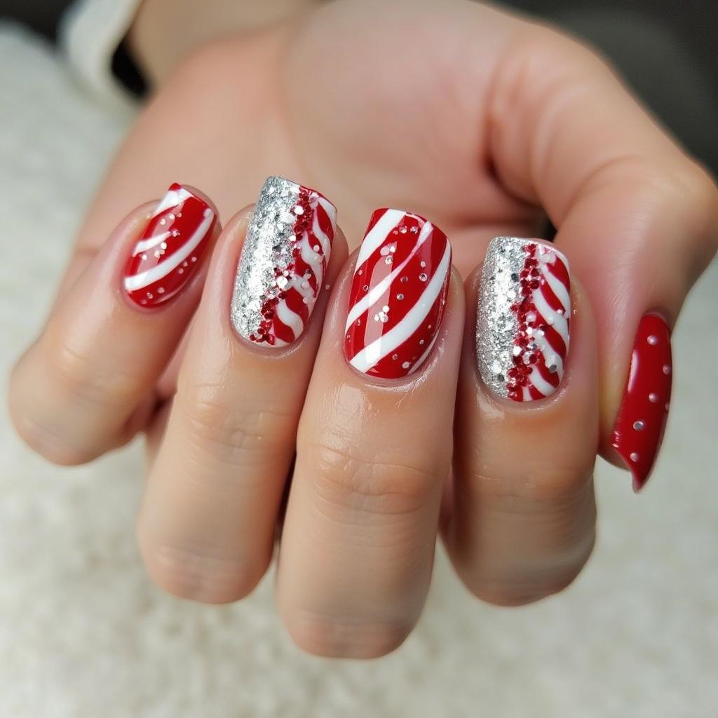 Combine the classic red and white candy cane stripes with a bit of silver glitter at the tips or along the stripes for a dazzling effect. This design is perfect for those who want a little extra glam for their holiday nails.