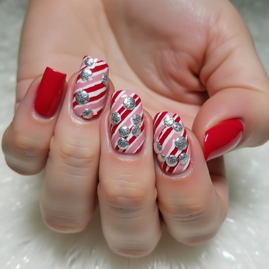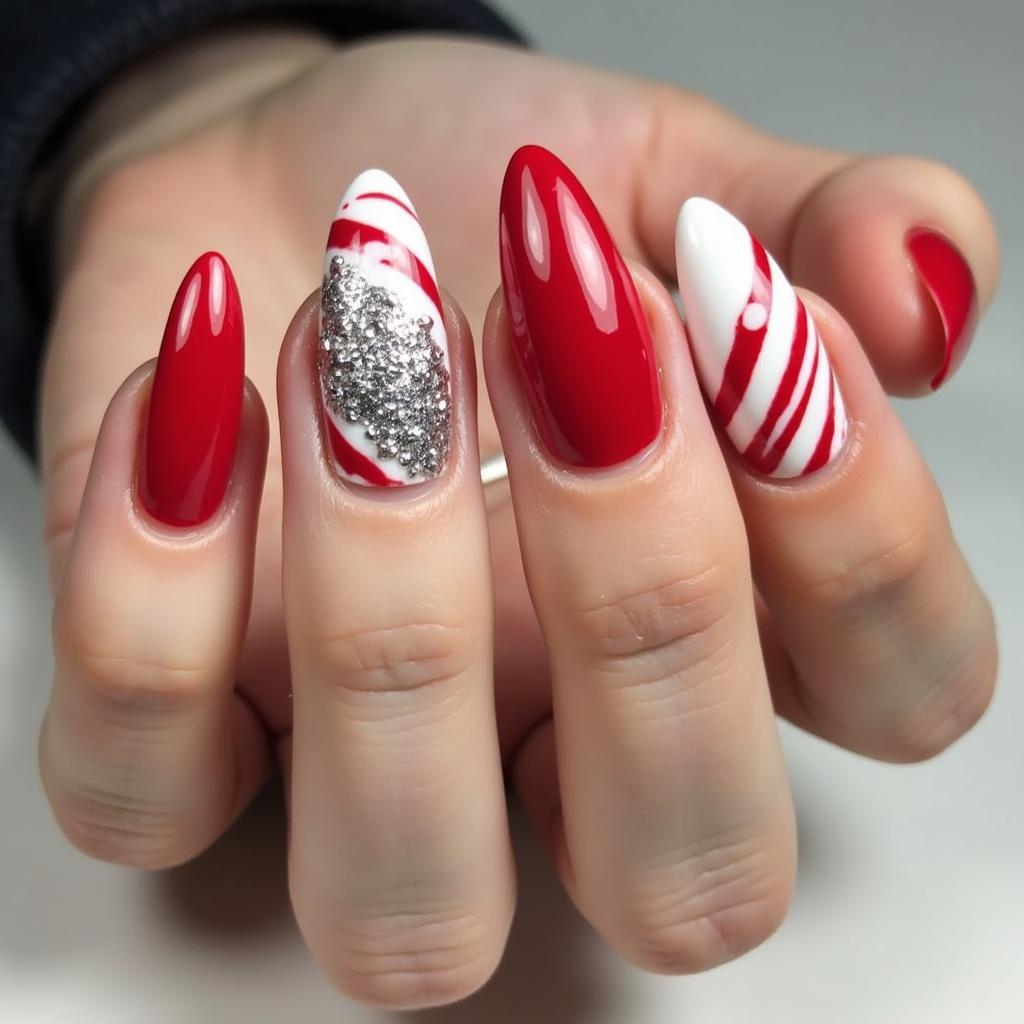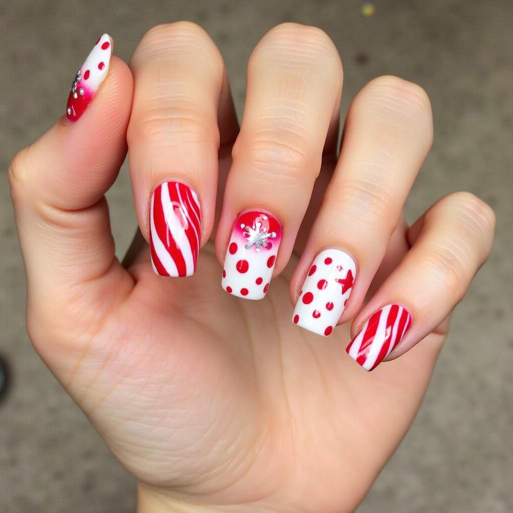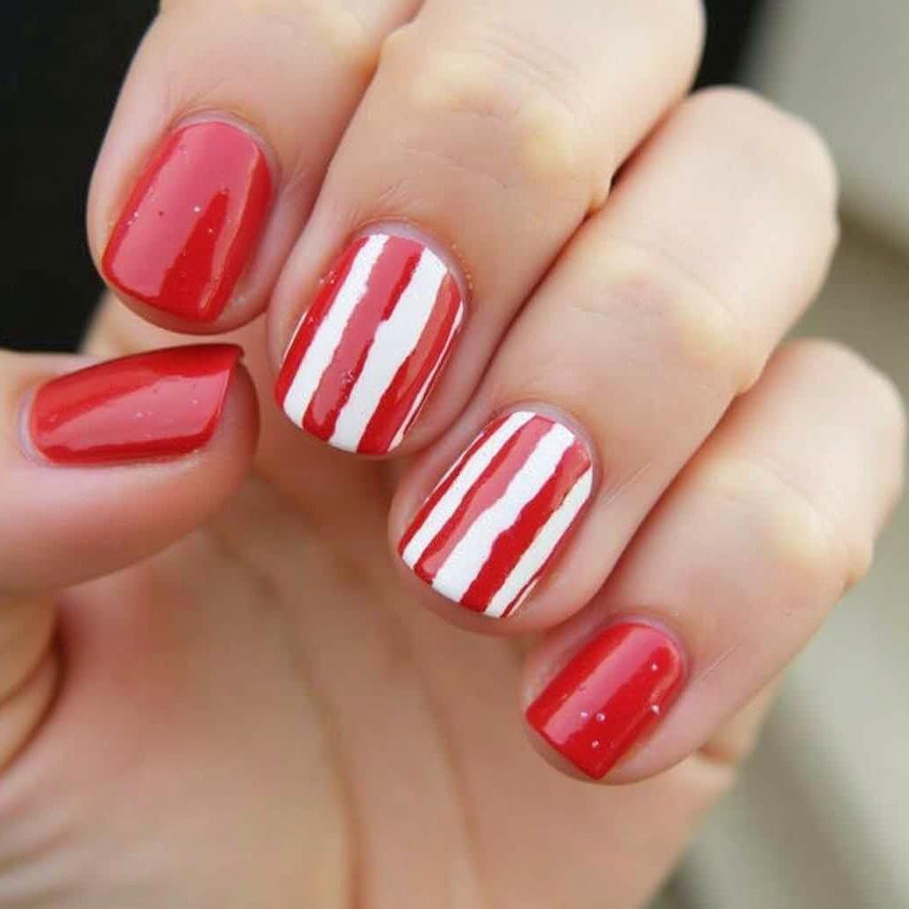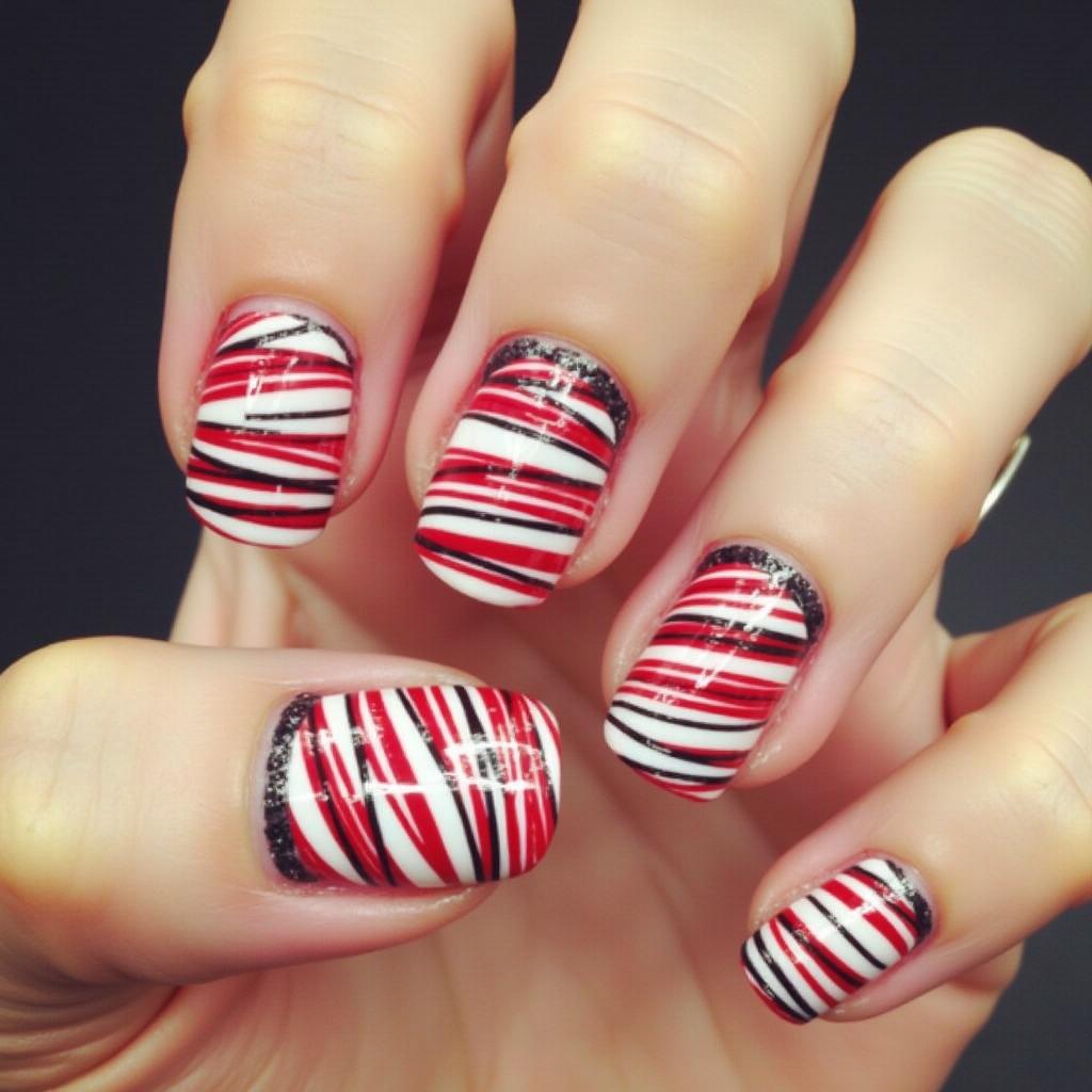 Combine the classic red and white candy cane stripes with a bit of silver glitter at the tips or along the stripes for a dazzling effect. This design is perfect for those who want a little extra glam for their holiday nails.