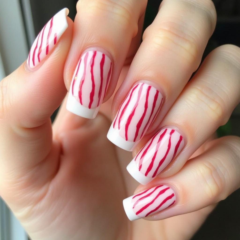 Switch up the classic French manicure by using candy cane stripes at the tips instead of the usual white. This modern twist on a classic style offers a unique and festive take on a traditional design.