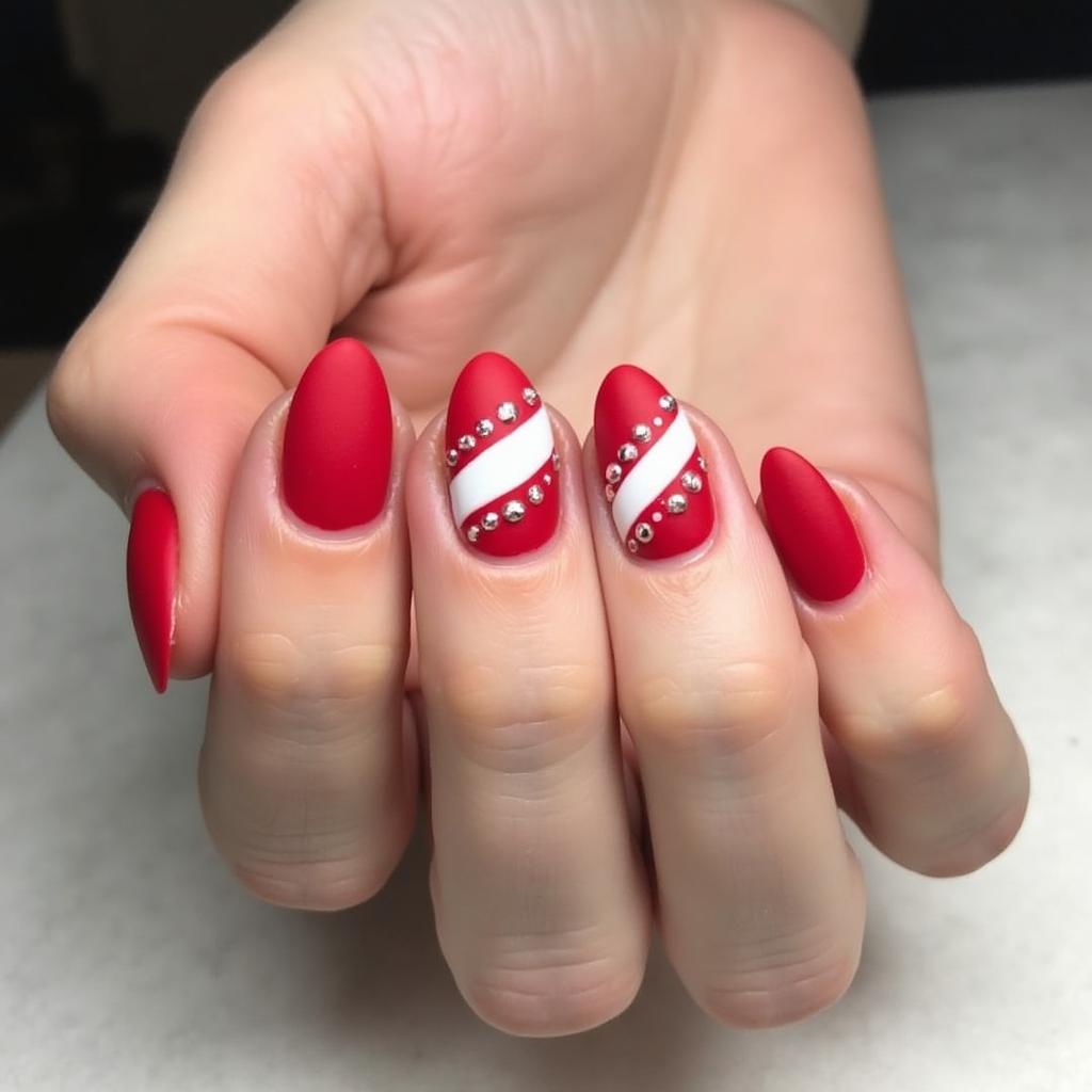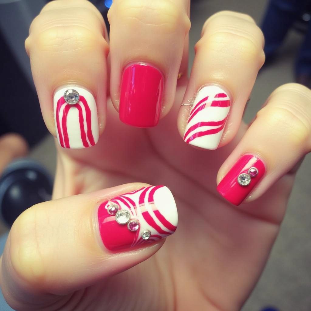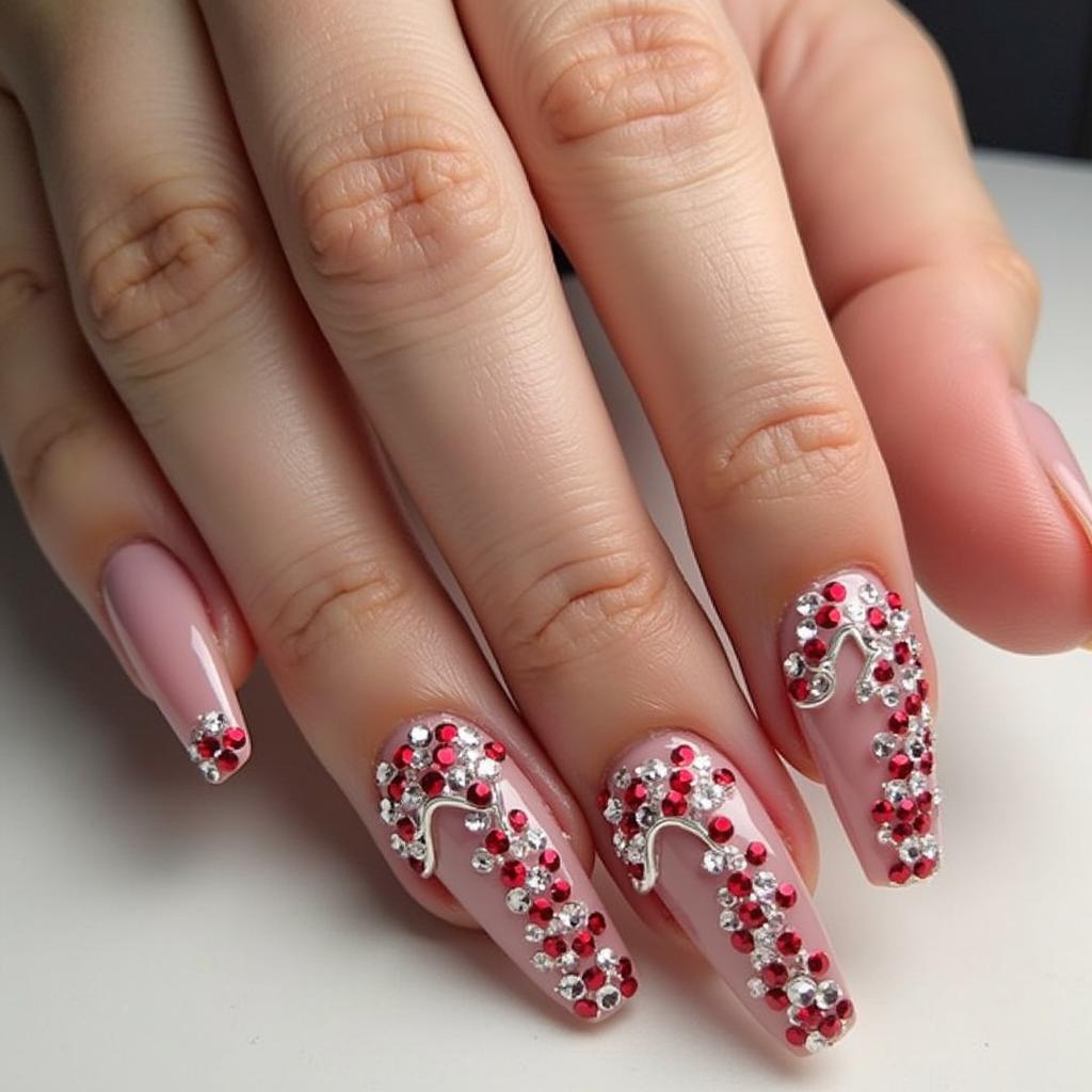 10. Candy Cane Nail Art with Rhinestones