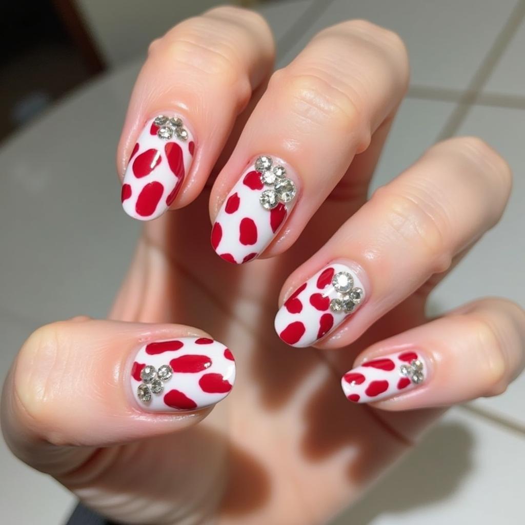 For a glamorous holiday look, add rhinestones to your candy cane nails. Place the rhinestones at the base of your nails or on top of the candy cane stripes for extra sparkle that will dazzle at any holiday party.