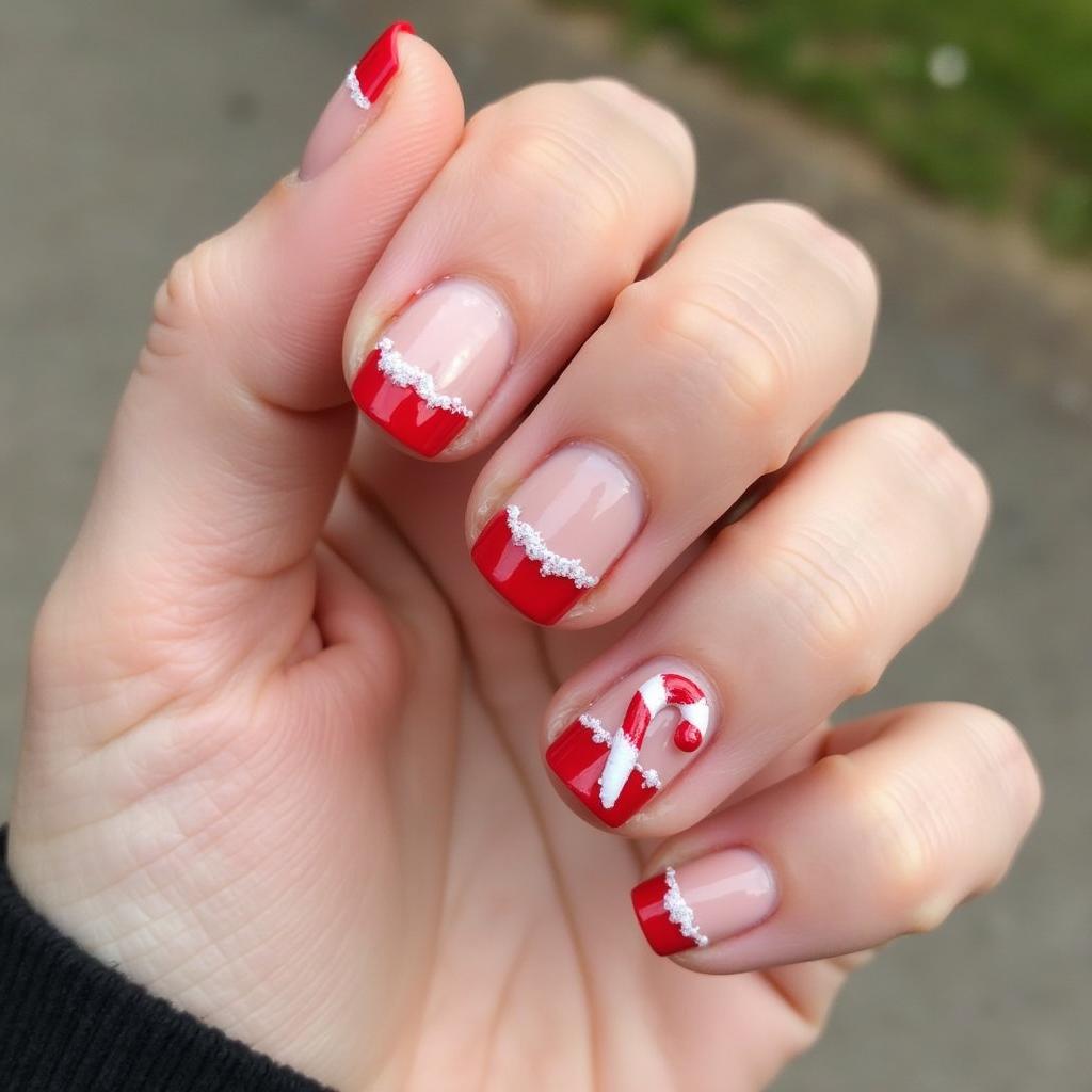 A French tip manicure gets a festive makeover with candy cane stripes at the tips. This design combines the sophistication of French tips with the playful look of candy cane stripes for a chic and seasonal manicure.