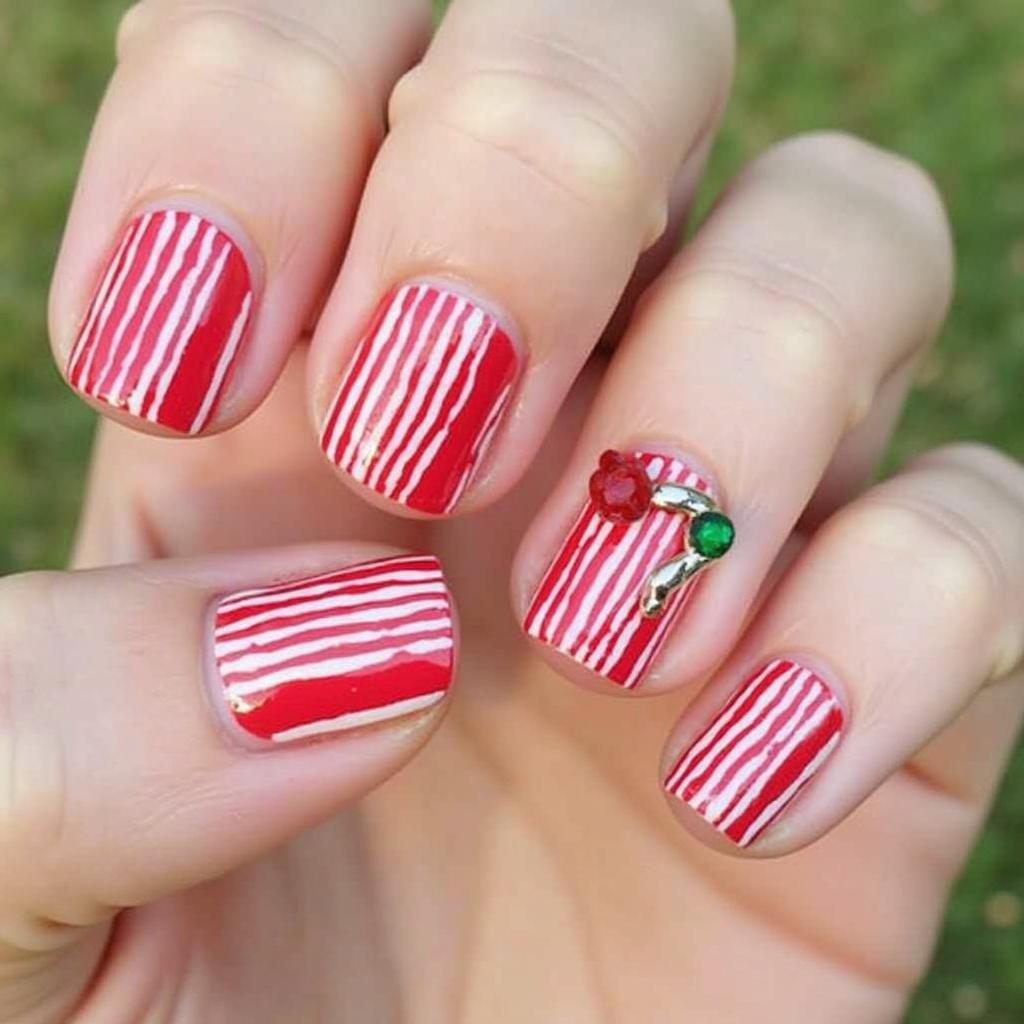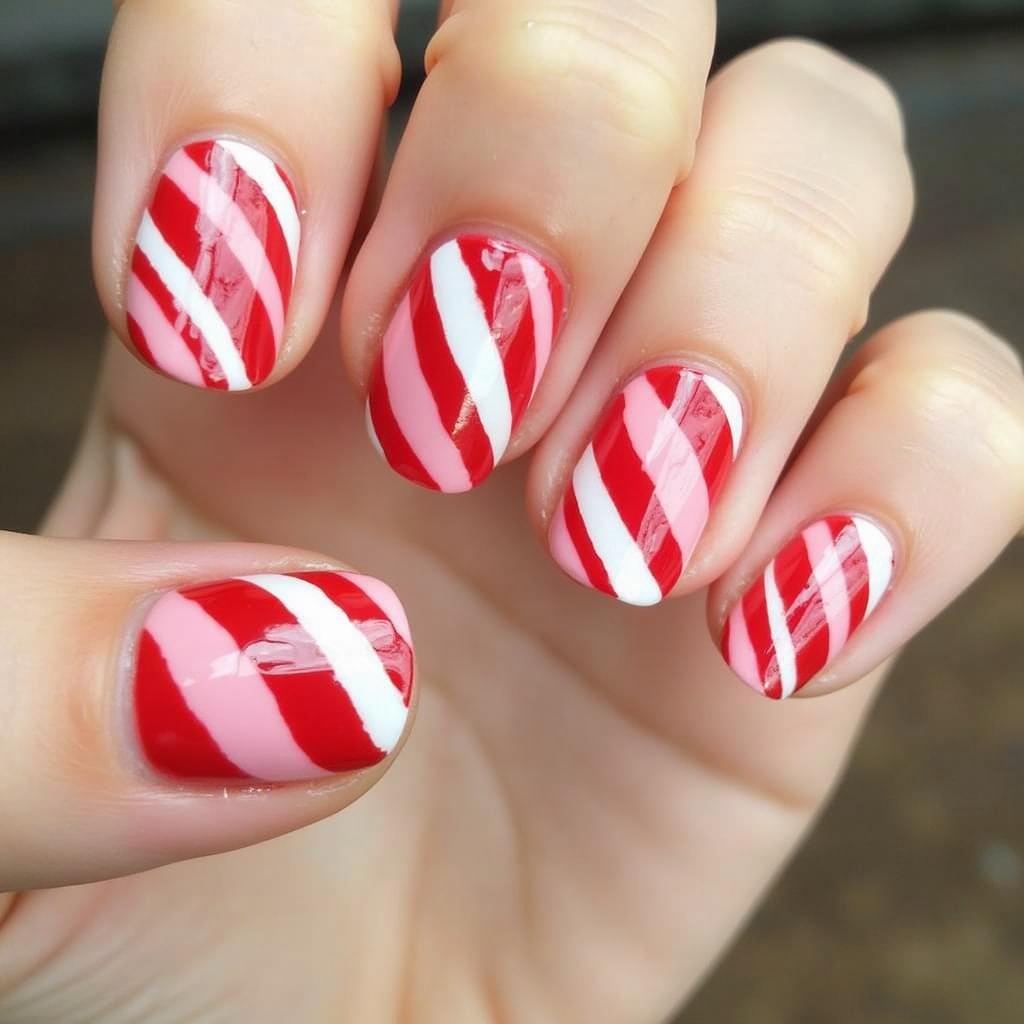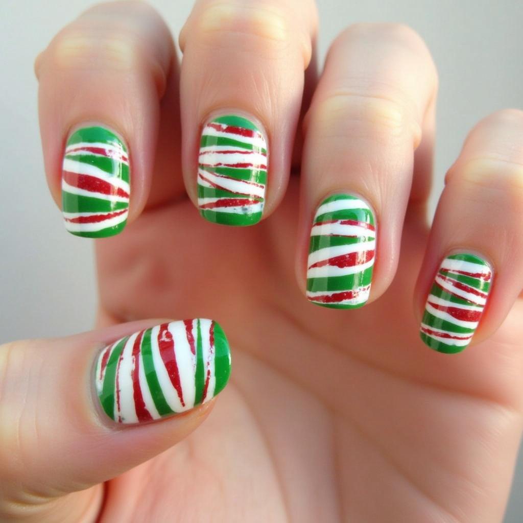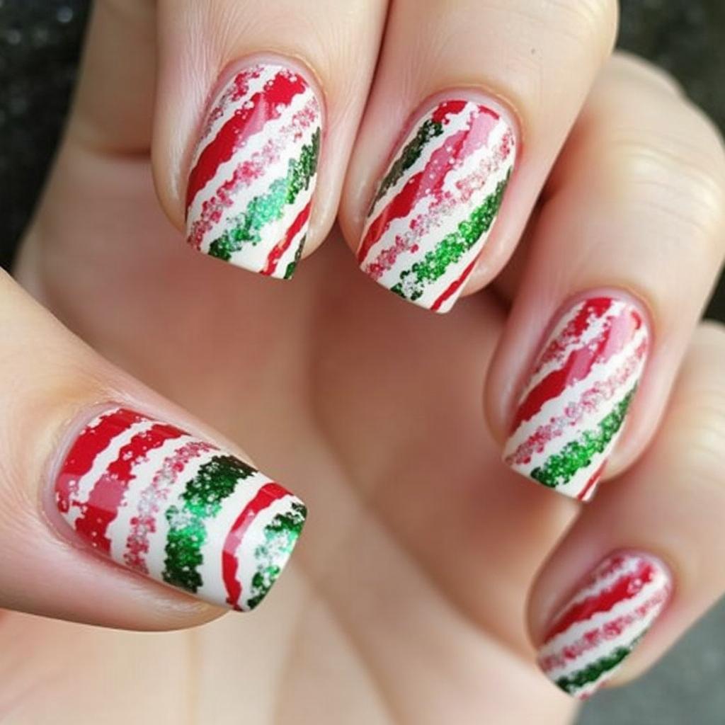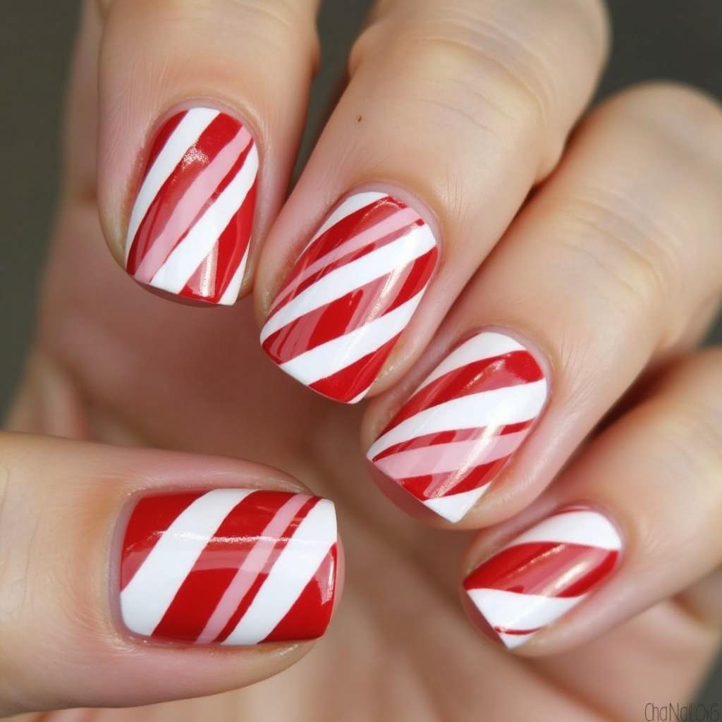Use both red and green to create a candy cane stripe design. The combination of red and green adds a vibrant, bold touch to your holiday nails, perfect for those who love traditional Christmas colors.