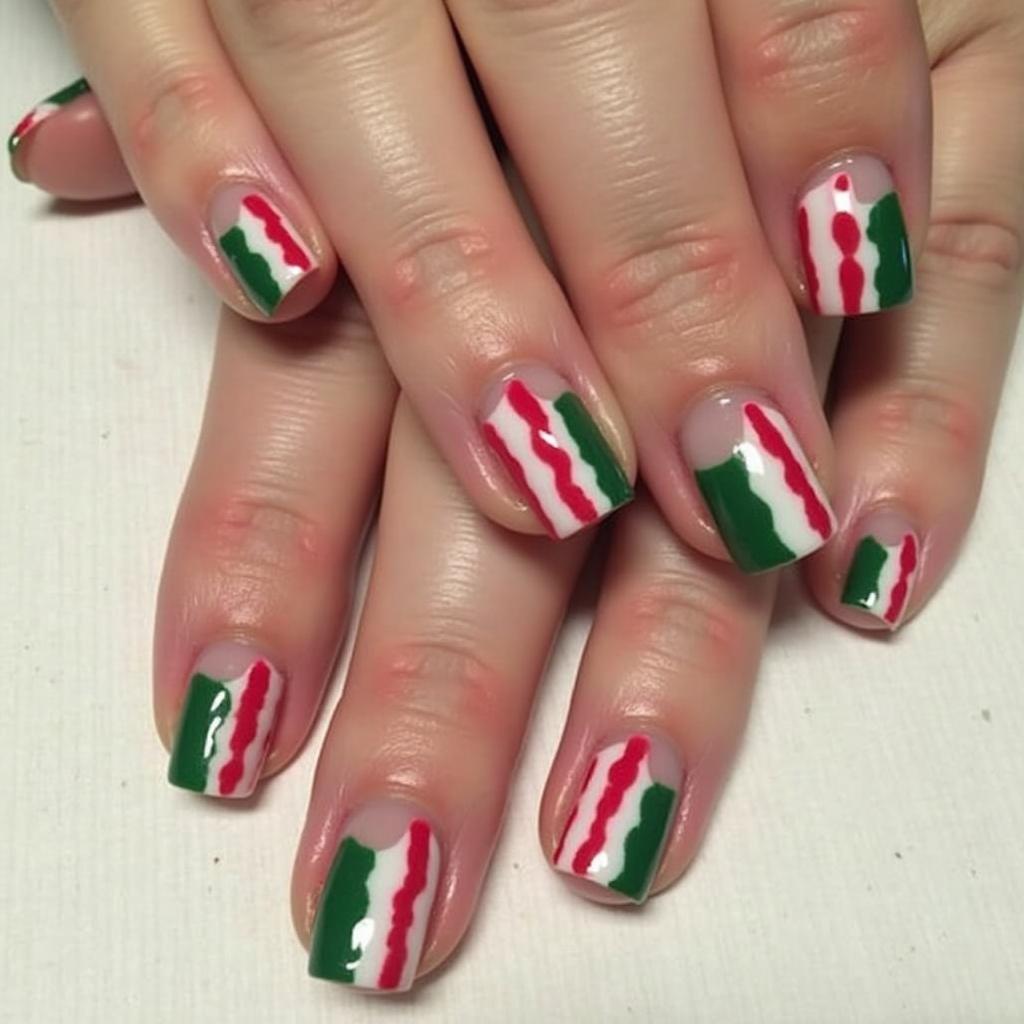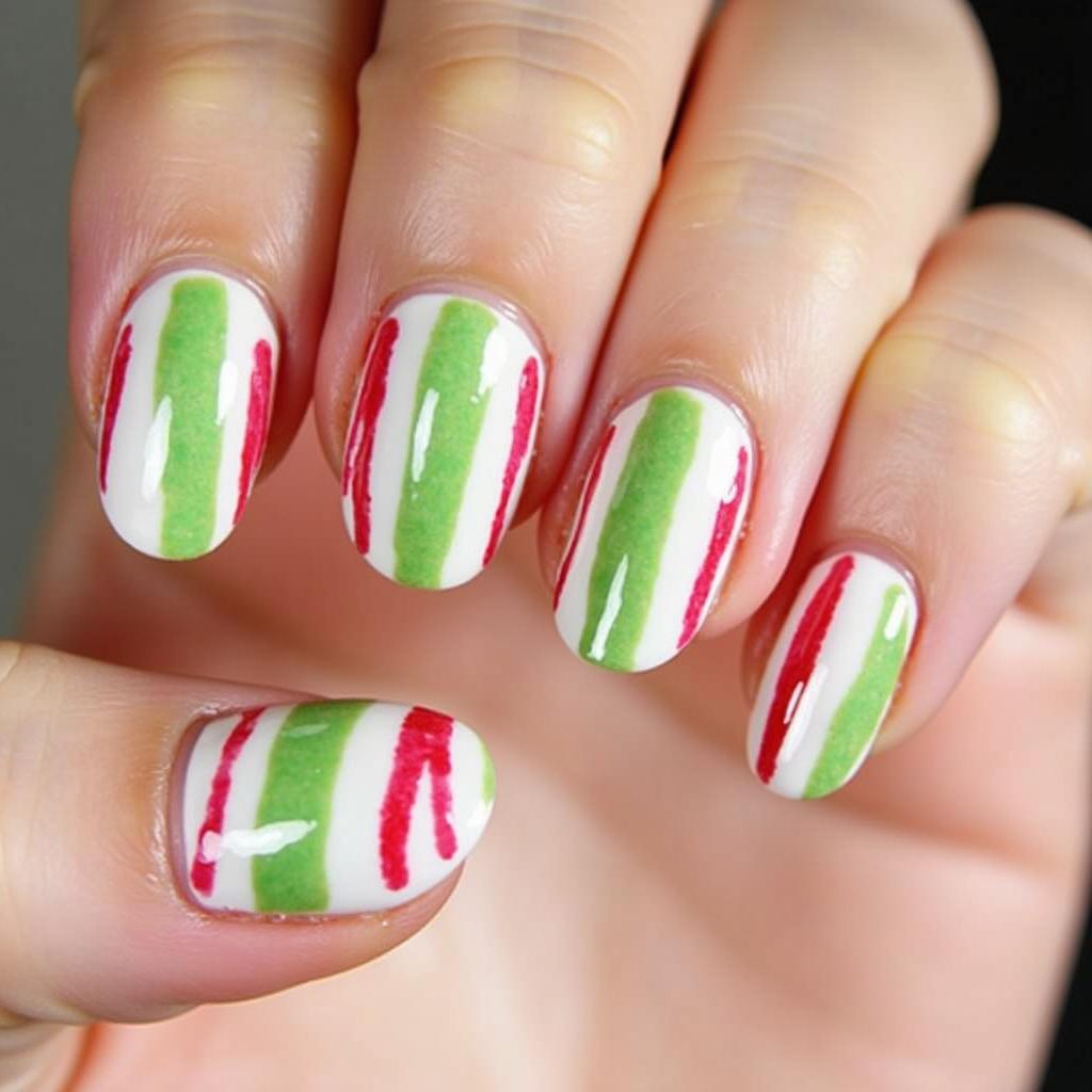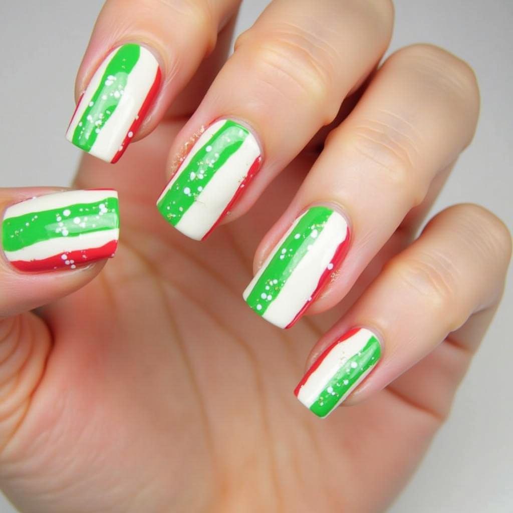 27. Candy Cane Nails with Green and Red Stripes