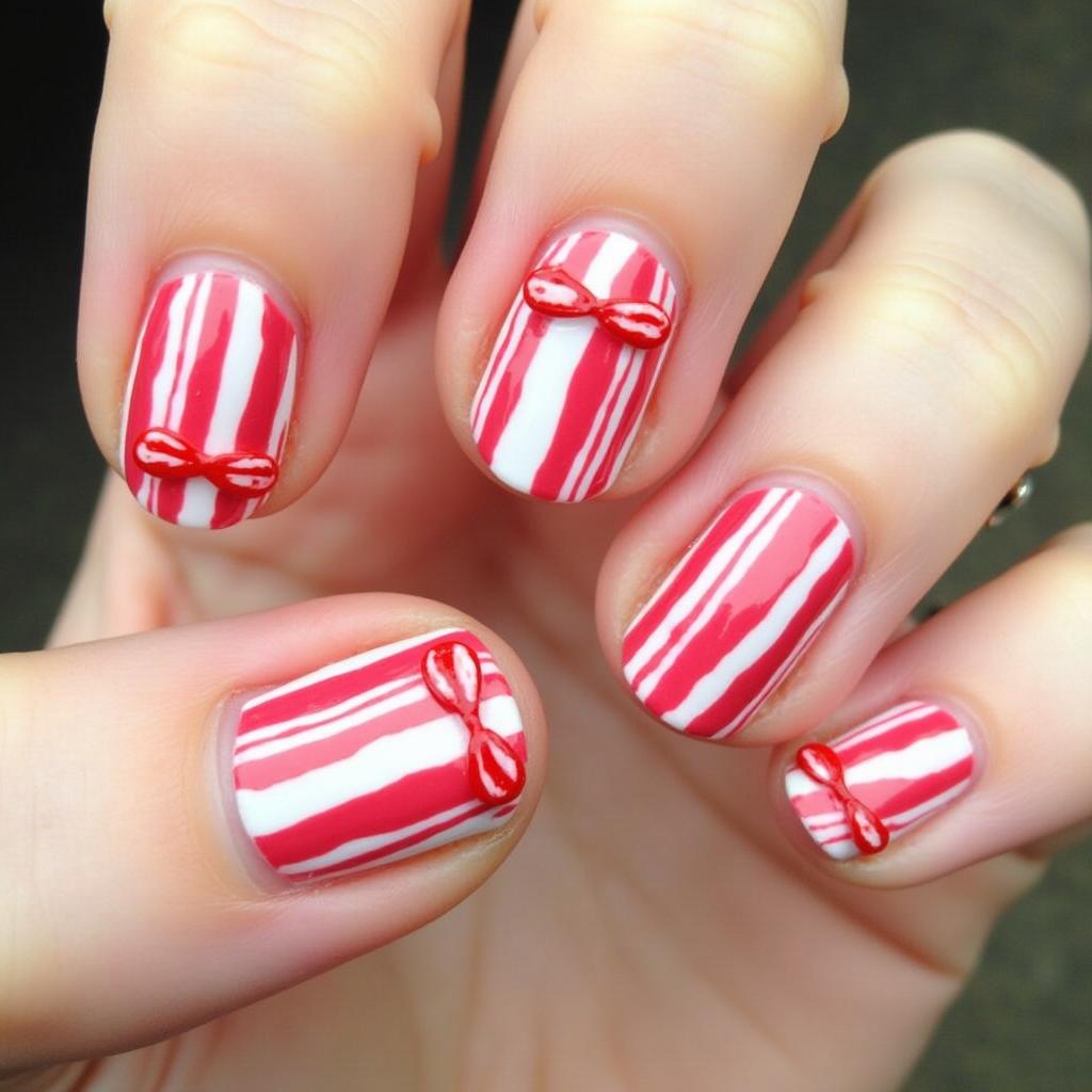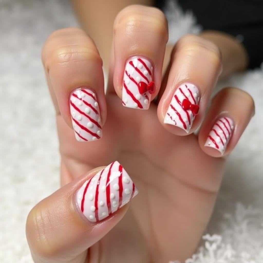 20. Candy Cane Nails with Tiny Bow Accents