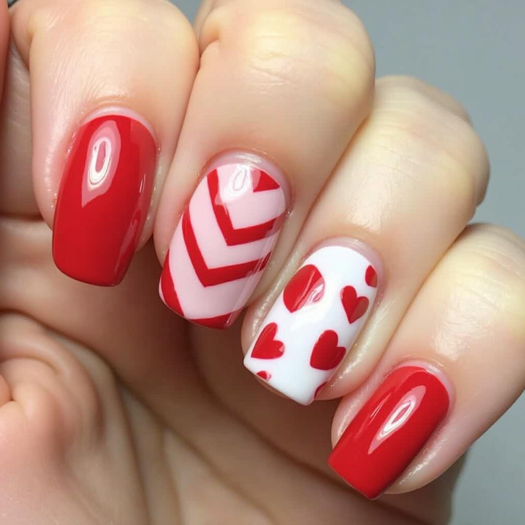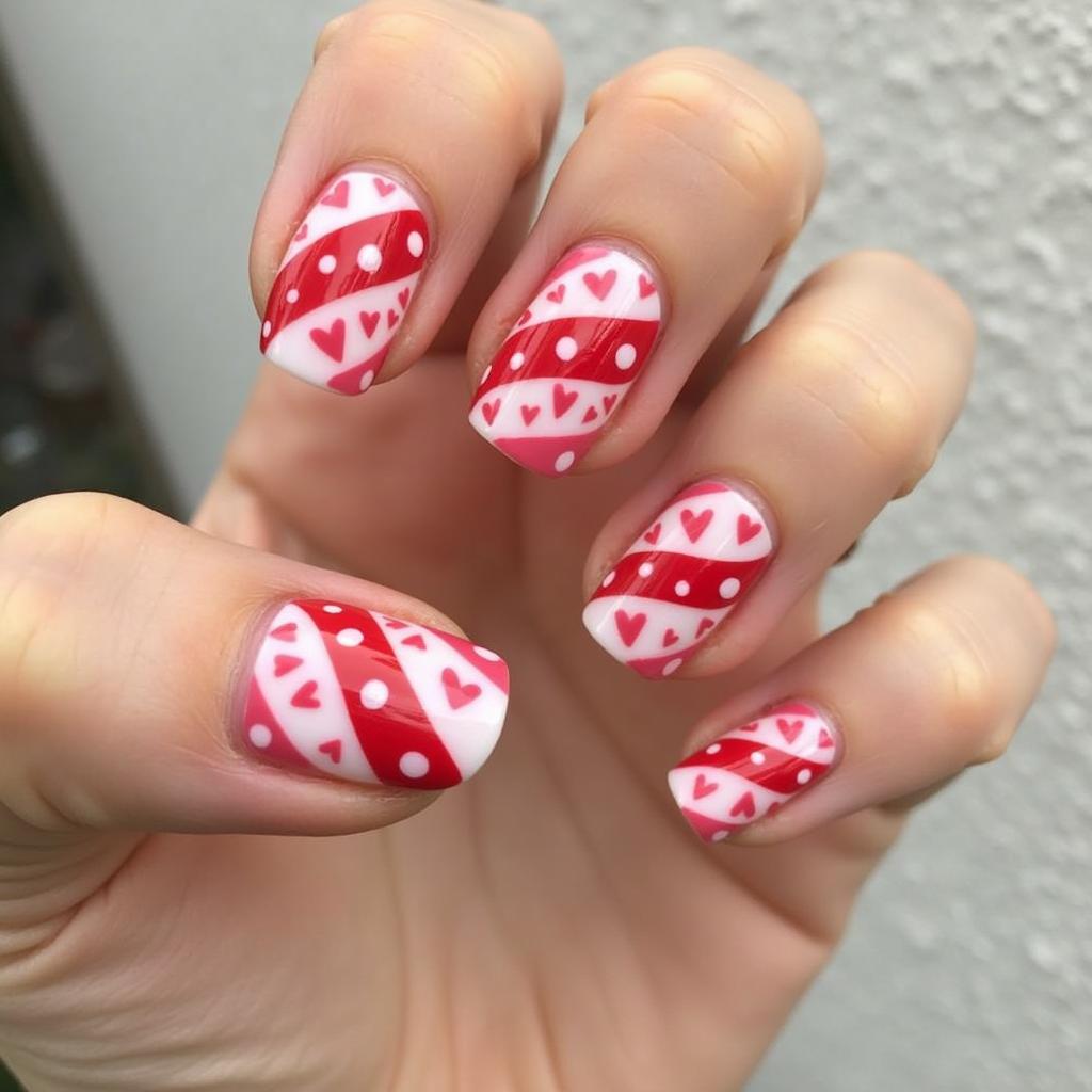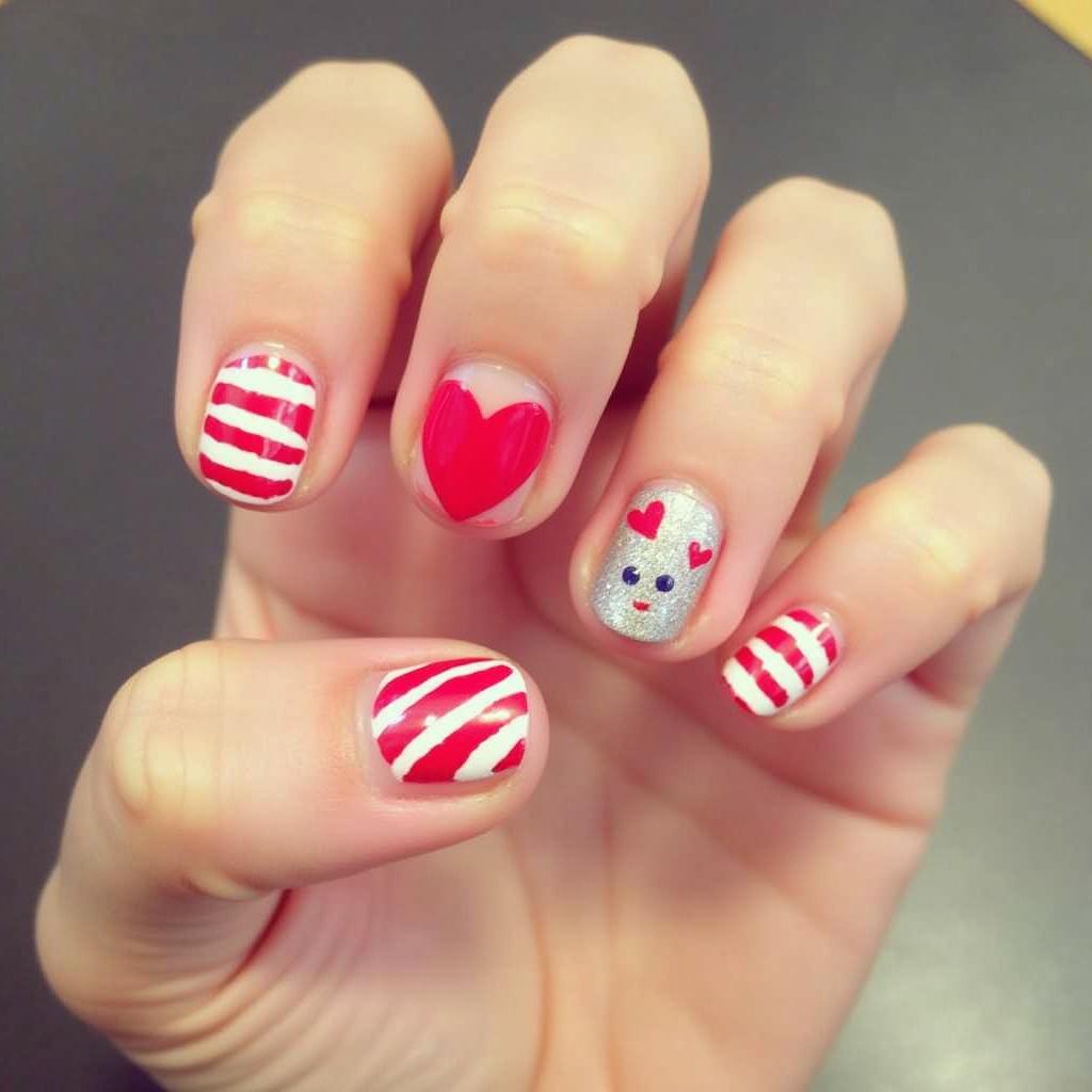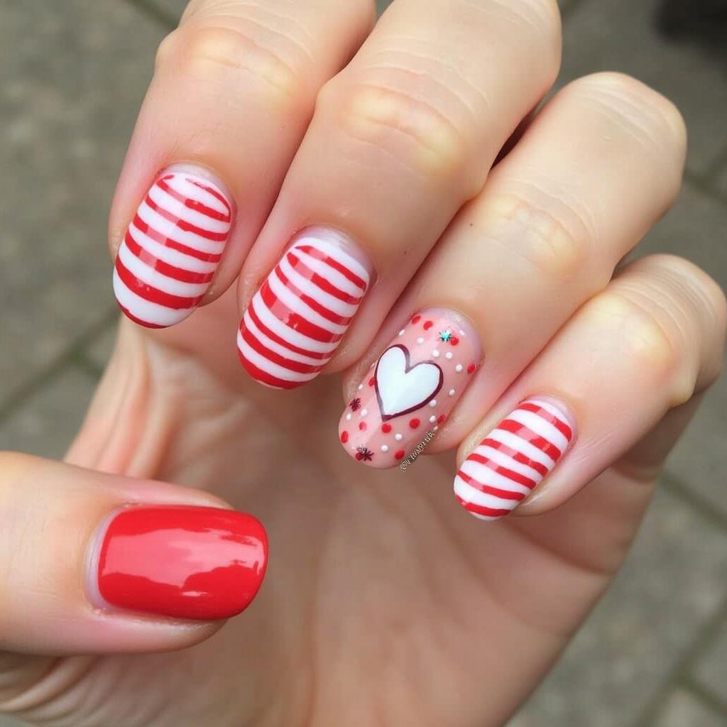 8. Candy Cane Stripe and Heart Nails