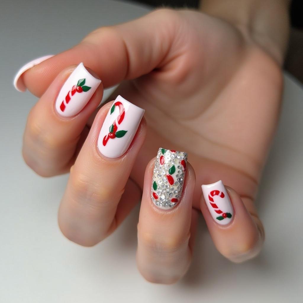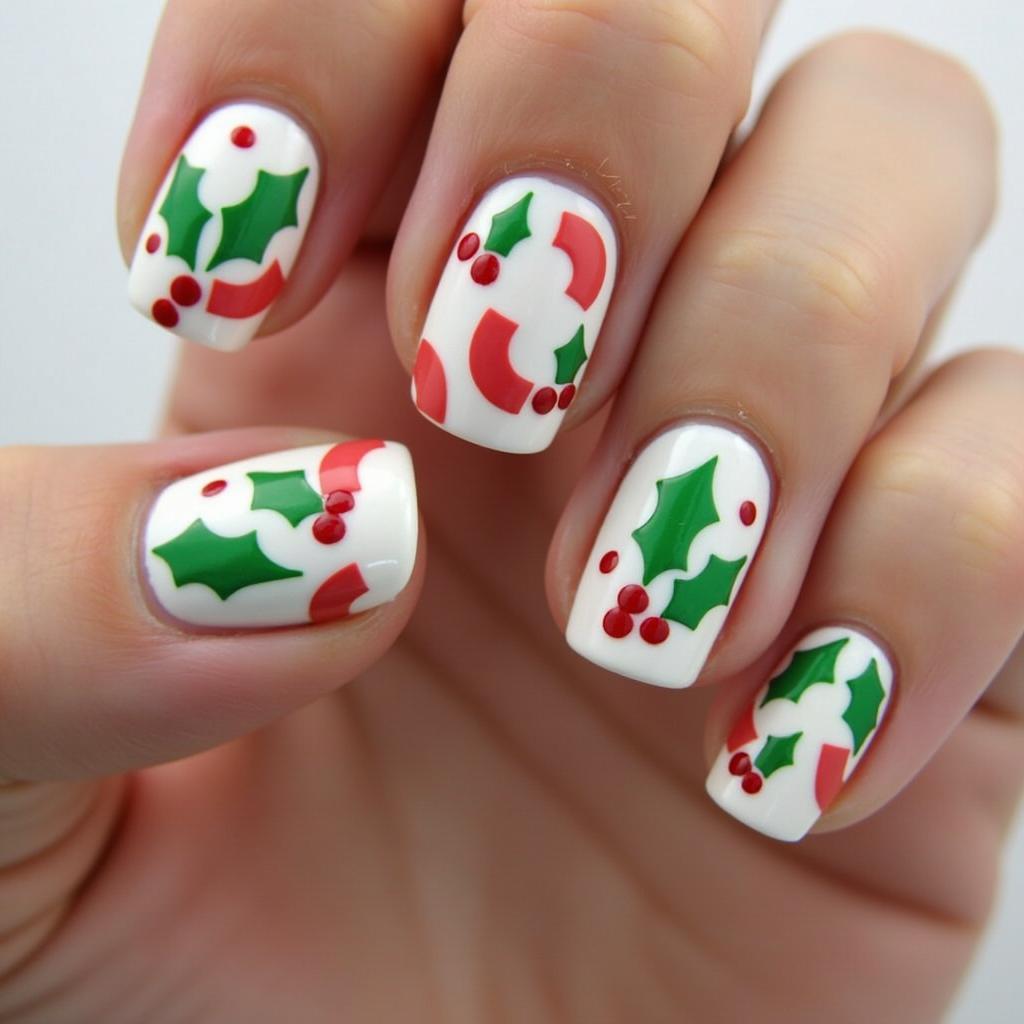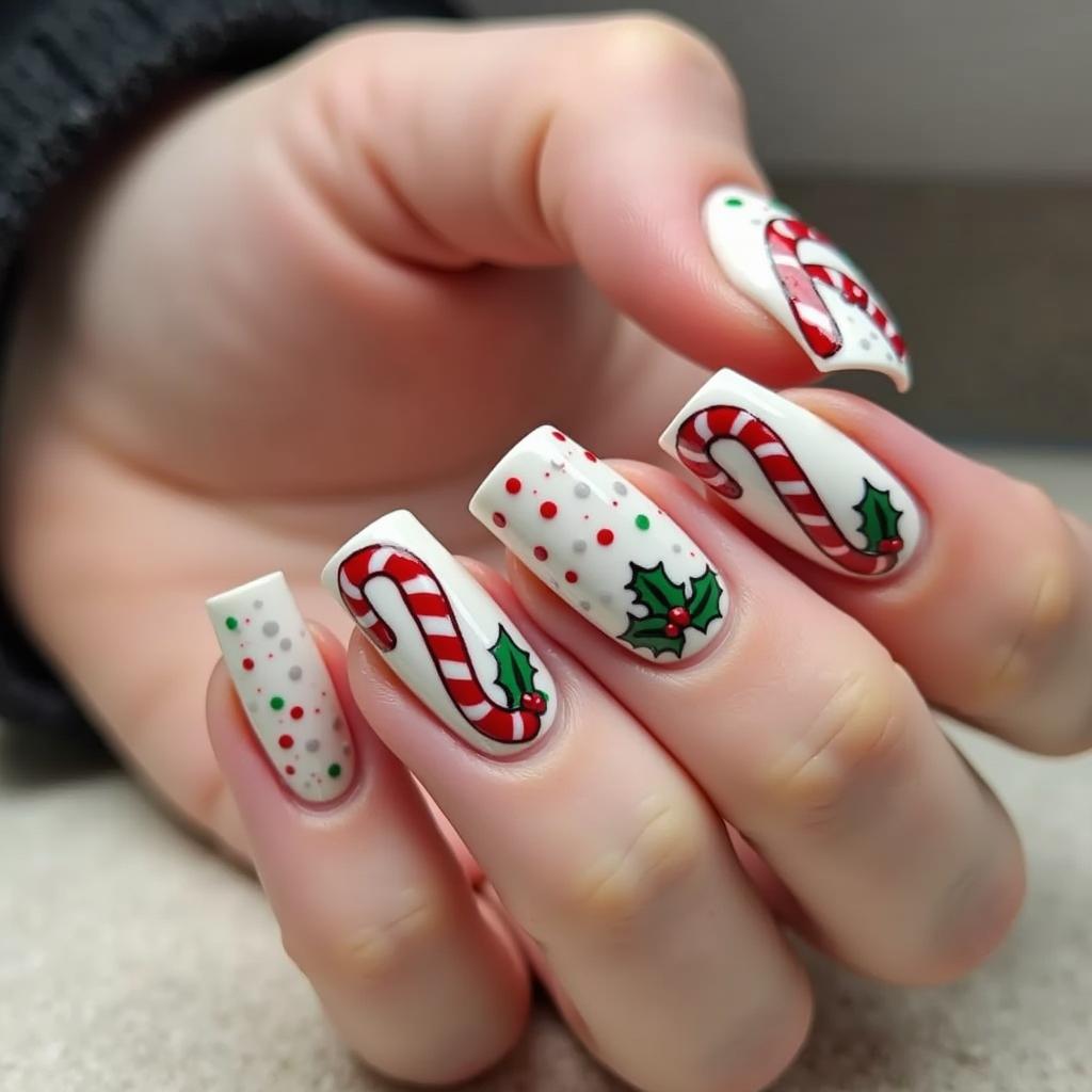 Incorporate green holly leaves alongside your candy cane stripes for a design that’s both festive and nature-inspired. This adds a traditional touch of Christmas to your manicure.