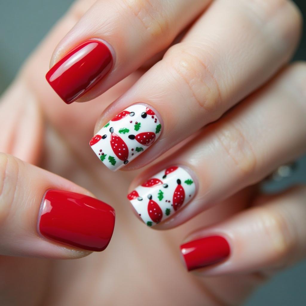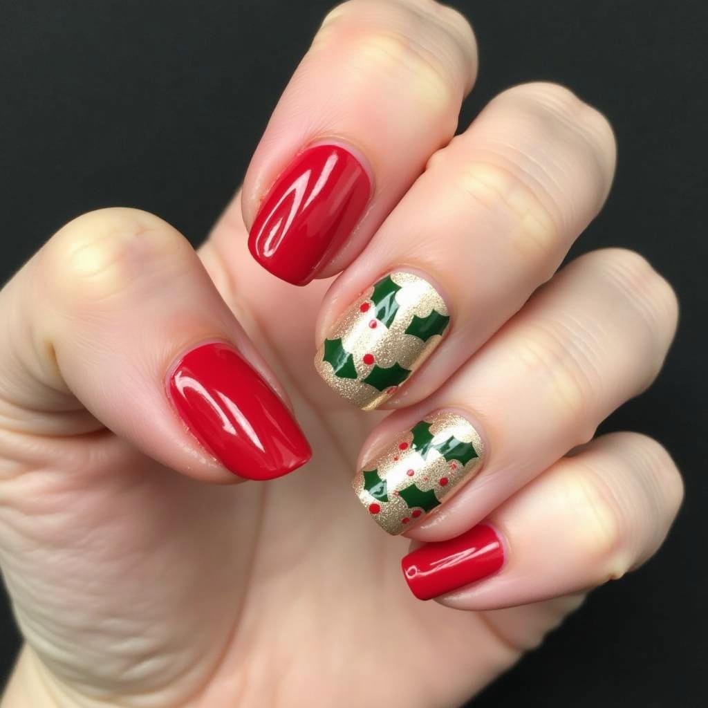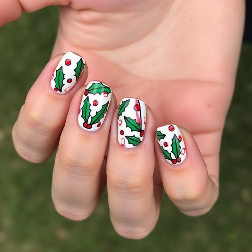 Incorporate green holly leaves alongside your candy cane stripes for a design that’s both festive and nature-inspired. This adds a traditional touch of Christmas to your manicure.