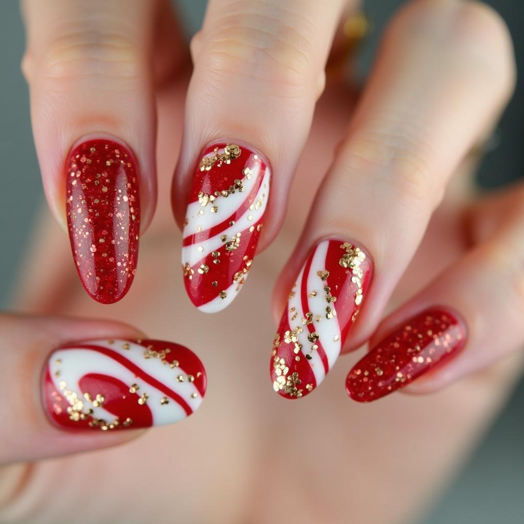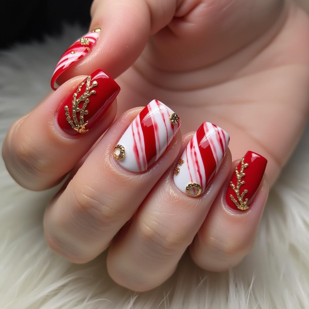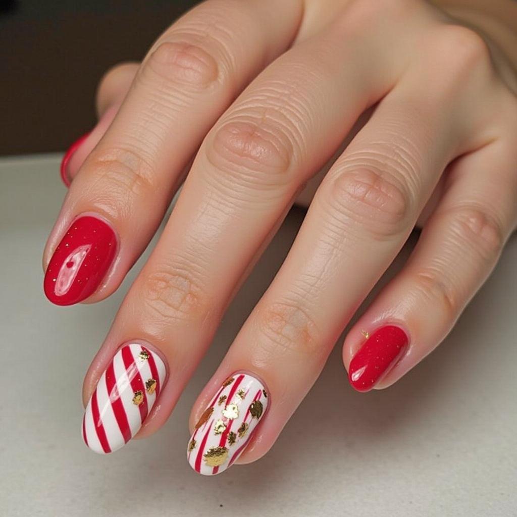 Pair your candy cane stripes with gold accents for a luxurious holiday design. Gold can be added to the tips, the stripes, or even as small dots along the nail to bring an extra festive touch.