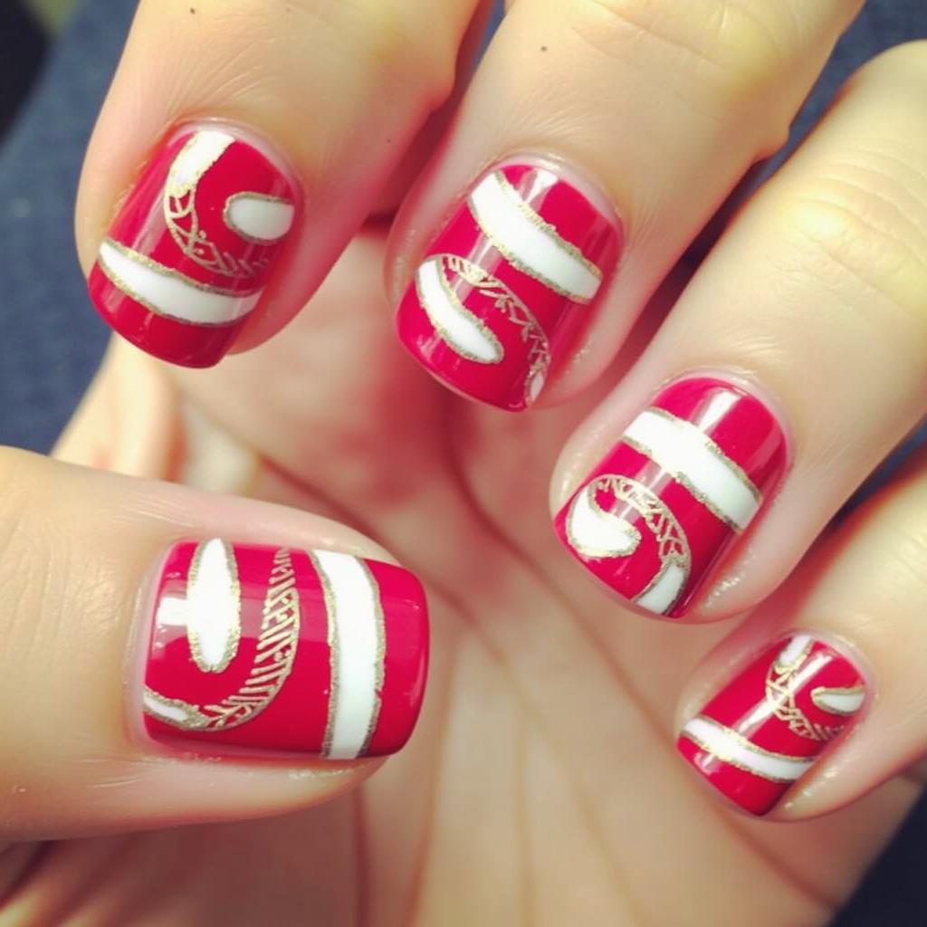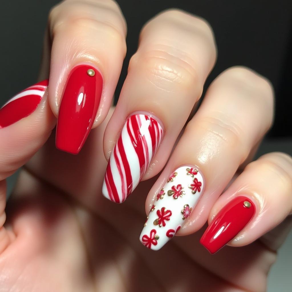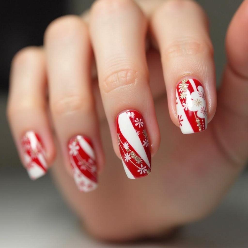 Pair your candy cane stripes with gold accents for a luxurious holiday design. Gold can be added to the tips, the stripes, or even as small dots along the nail to bring an extra festive touch.
