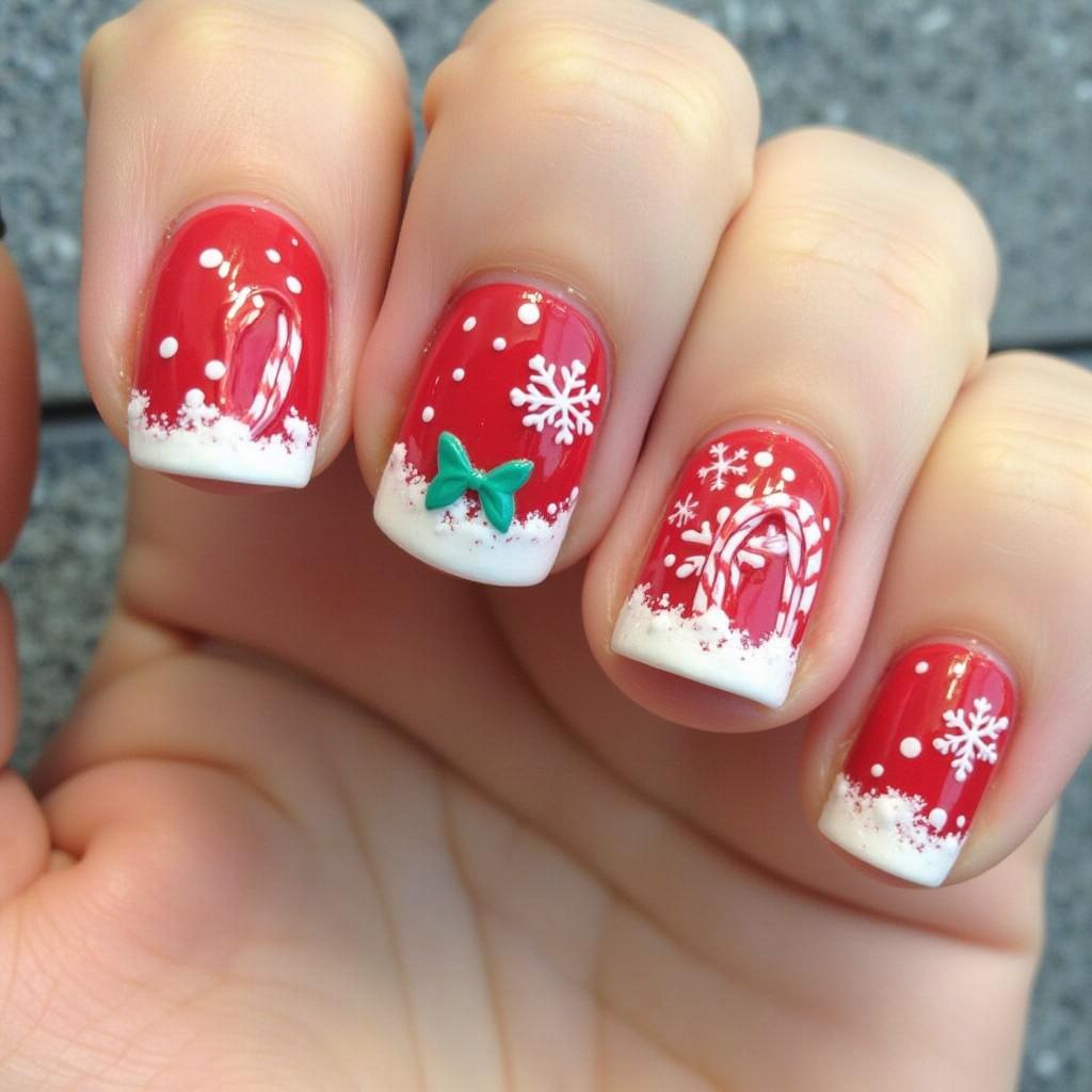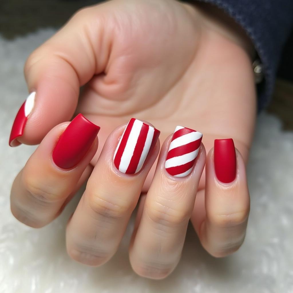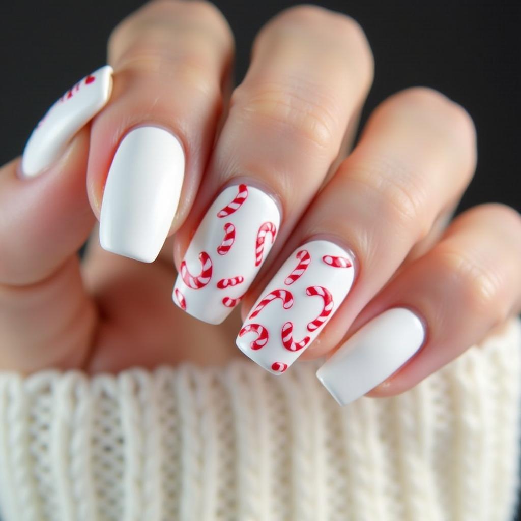 For a more minimalist design, keep the base of your nails matte white and add small candy cane accents to just a few nails. This subtle approach allows you to keep things understated while still embracing the holiday spirit.