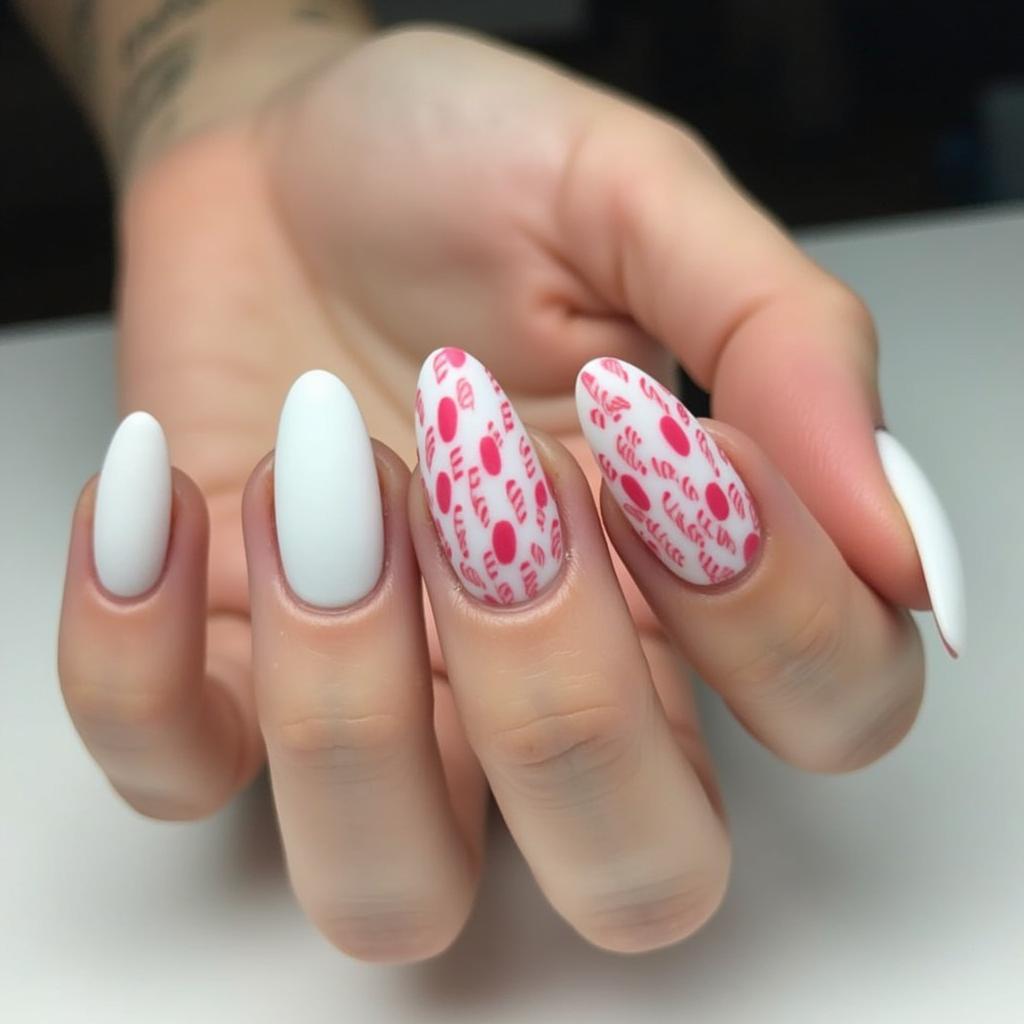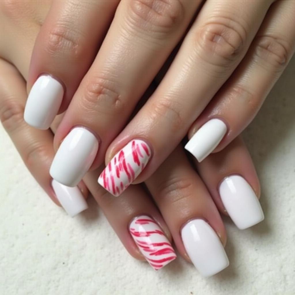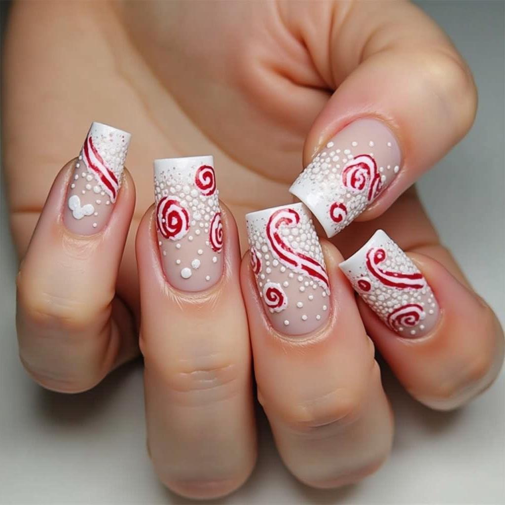 For a more minimalist design, keep the base of your nails matte white and add small candy cane accents to just a few nails. This subtle approach allows you to keep things understated while still embracing the holiday spirit.