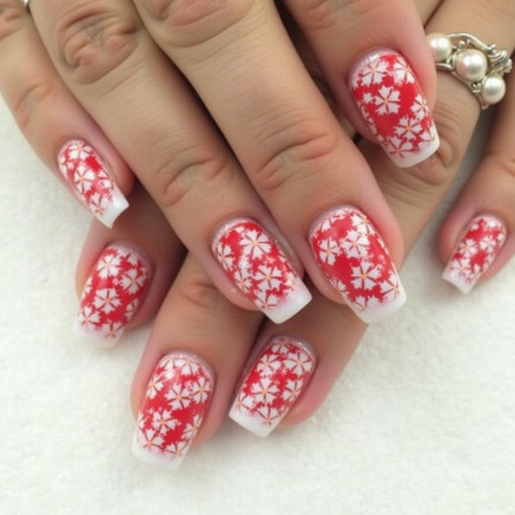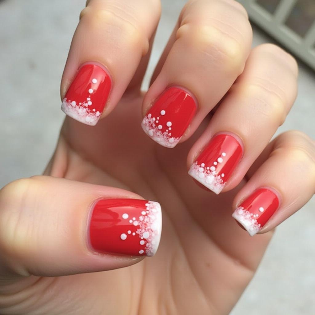 Cover your nails in full red with a frosted white tip to create a bold yet festive design. The frosted tips give a cool, snowy feel to the otherwise bright red base, perfect for a dramatic holiday look.