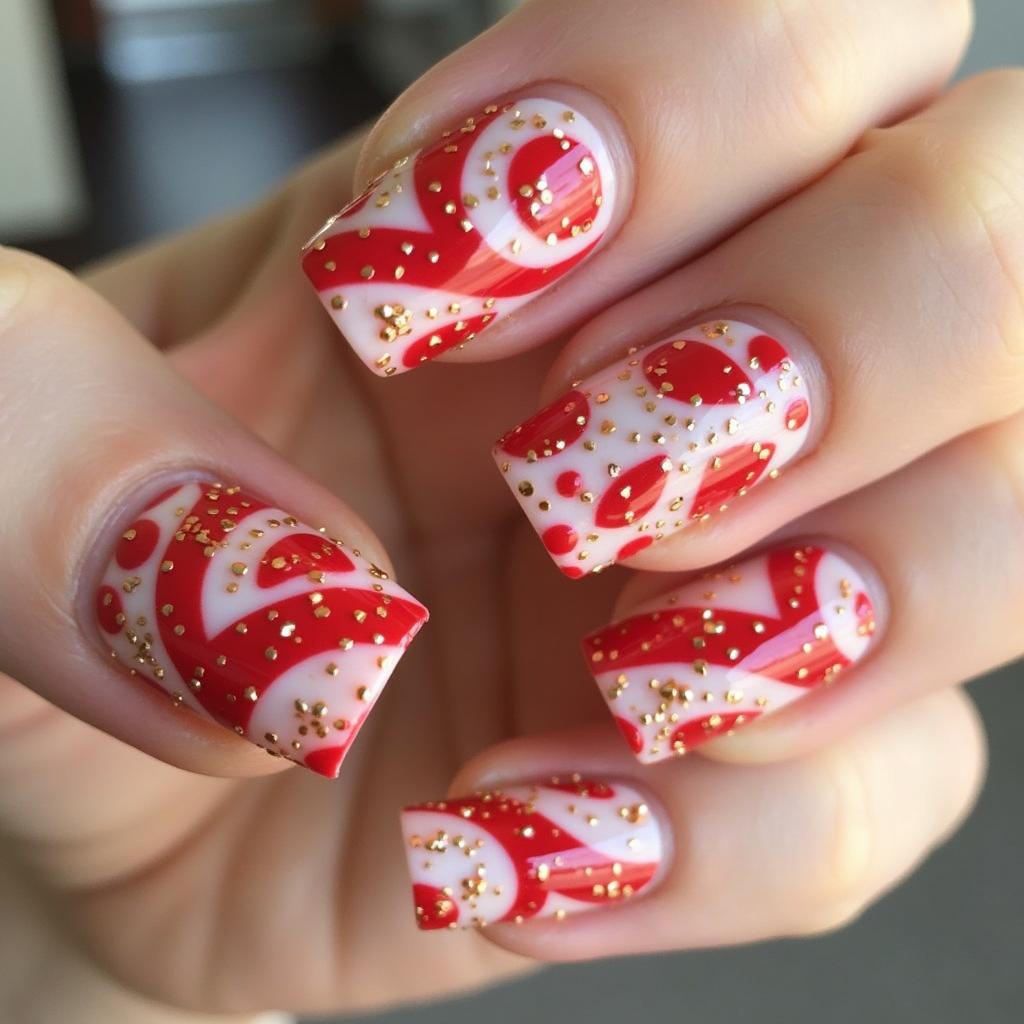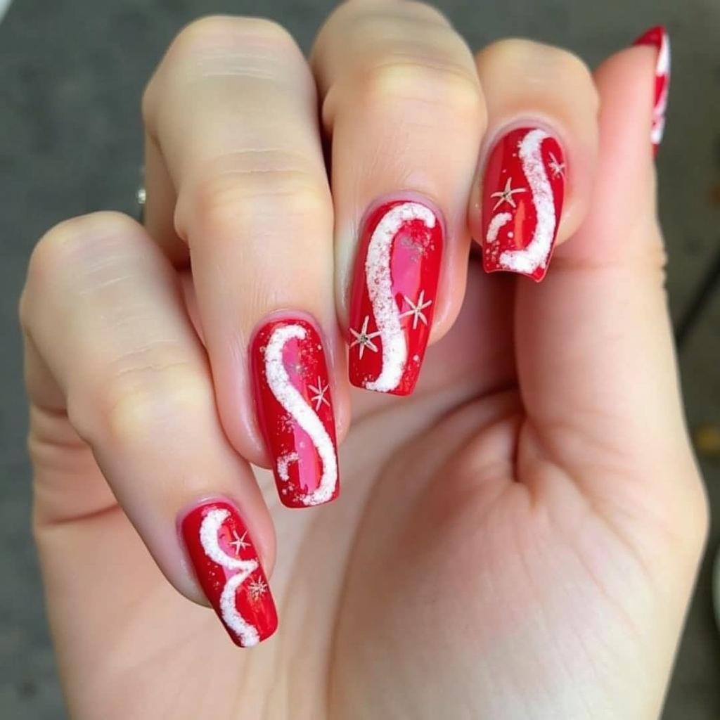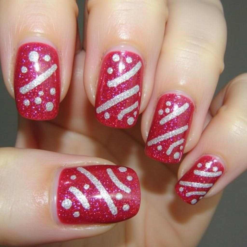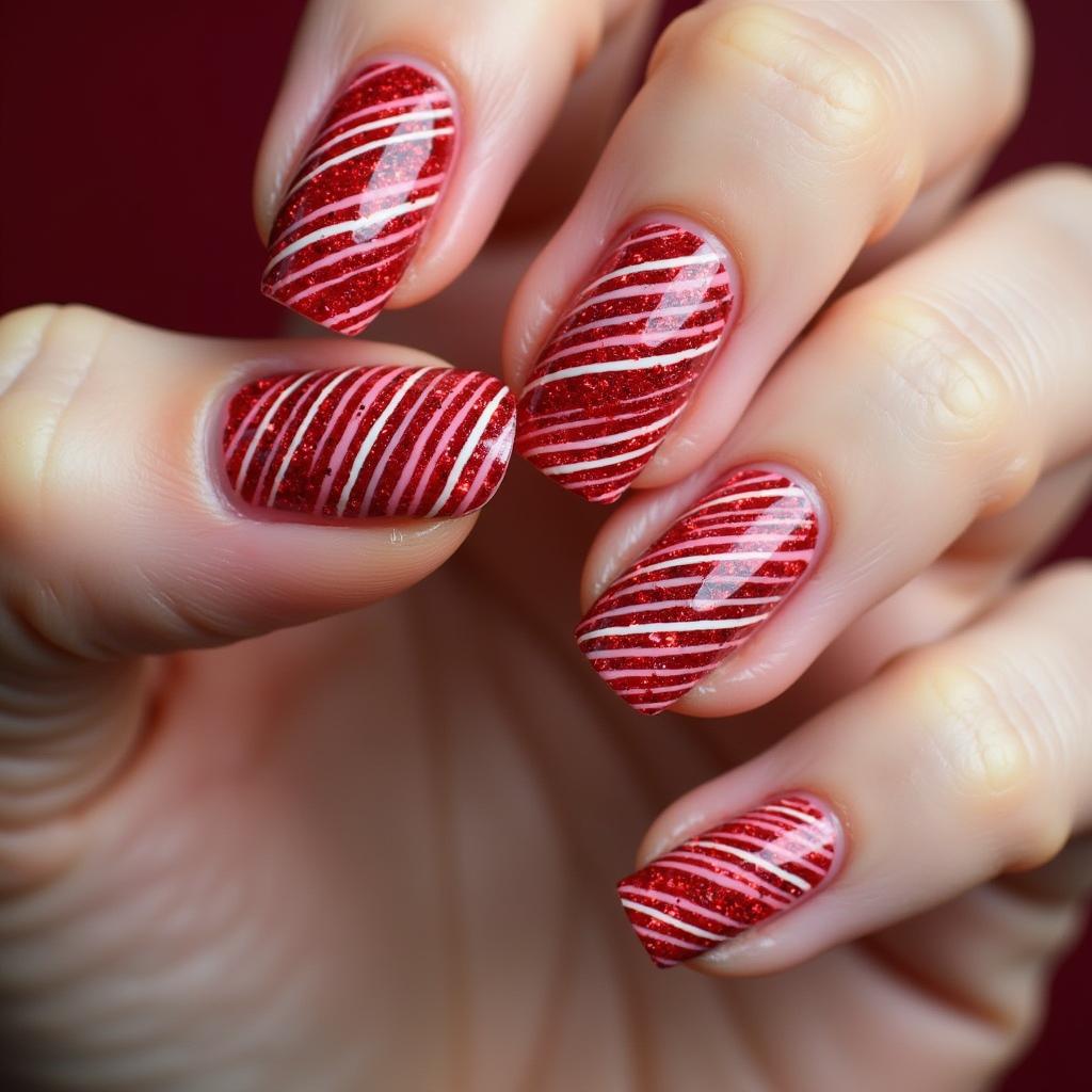 Infuse a little extra sparkle by adding red glitter to the candy cane stripes. The glitter will give the design an extra pop, making it ideal for parties or any event where you want your nails to shine.