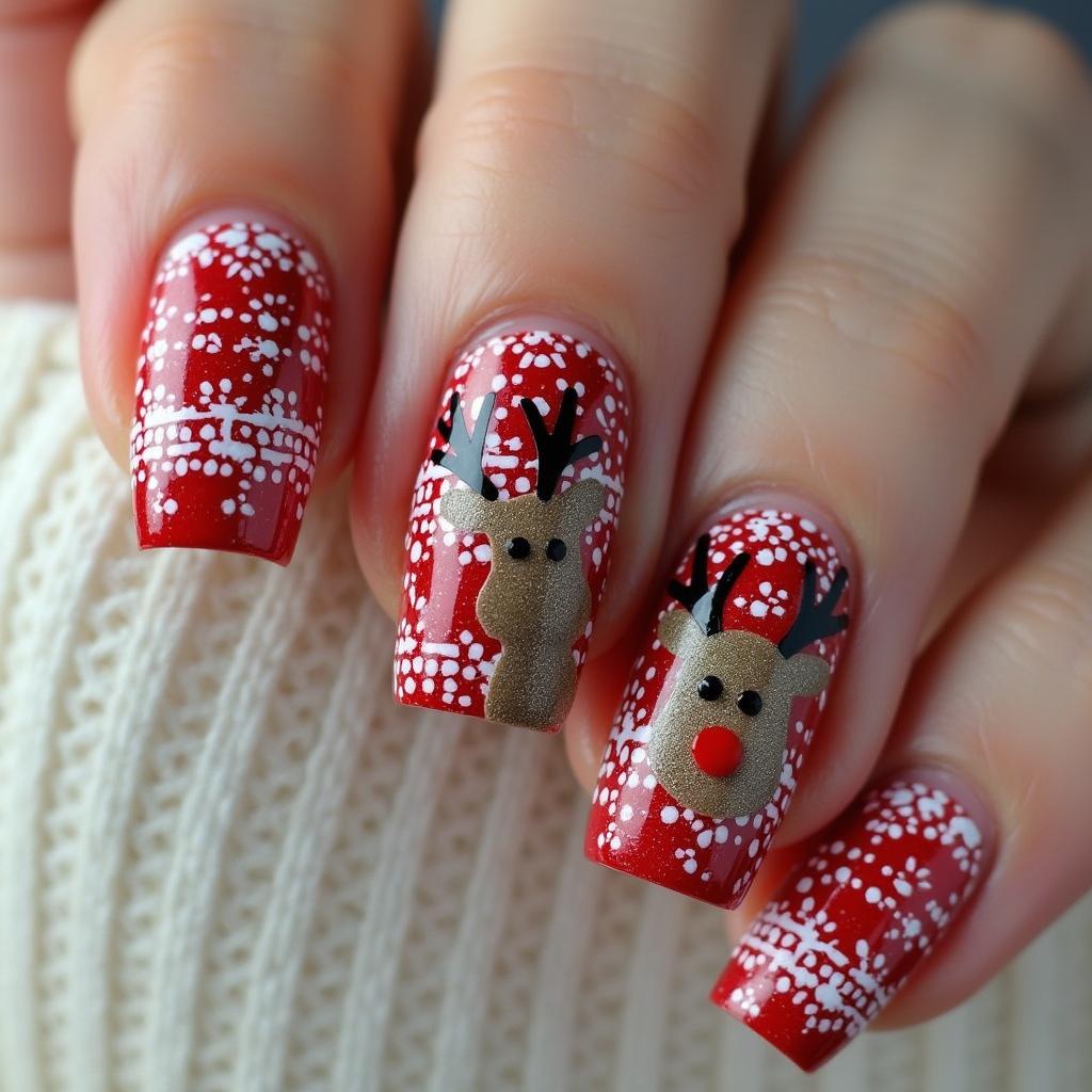For a fun and cozy look, create a Christmas sweater pattern with red, green, and white details on your nails. Add little snowflakes or reindeer for extra holiday flair, combining both wintery and Christmas themes into one adorable design.