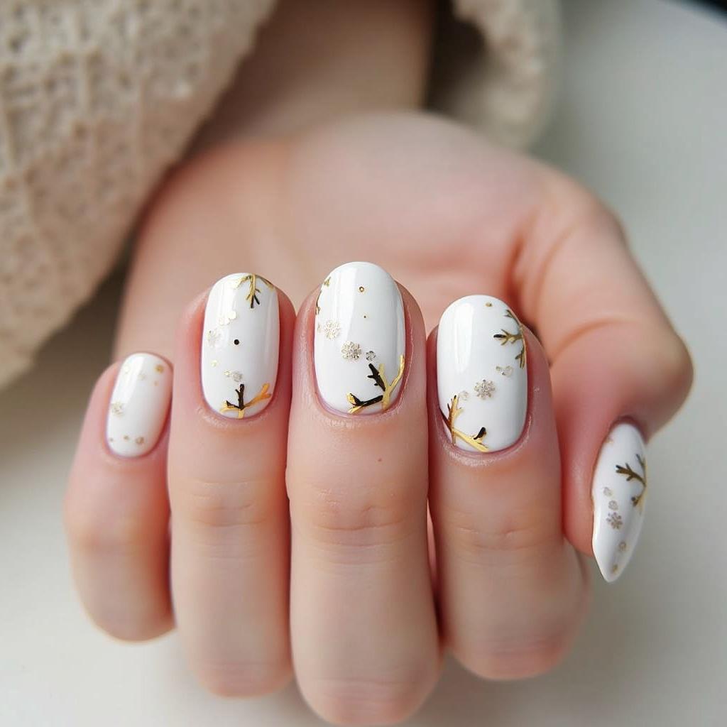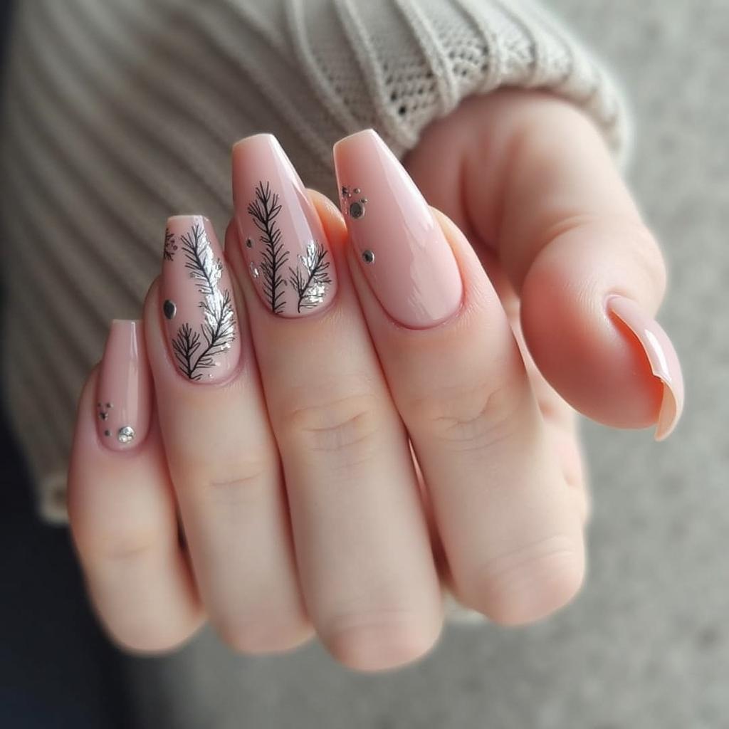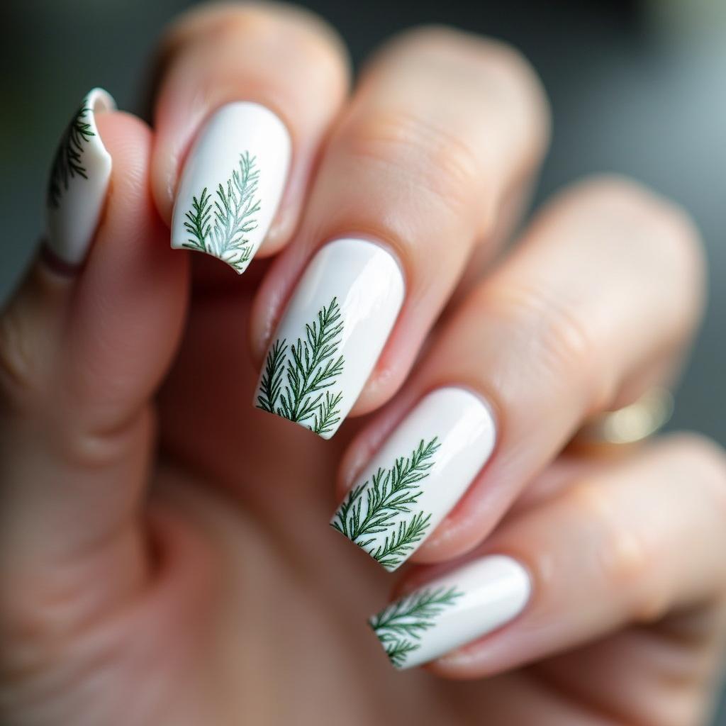 Paint frosty pine branches on your nails using white and silver accents over a deep green or blue base. This design is perfect for those who love a minimalist winter touch with a Christmas twist.