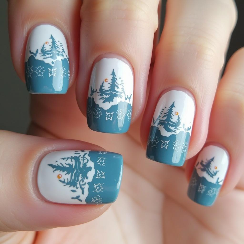 For a winter-themed design, paint snow-capped mountain peaks on your nails. Pair this with a soft white or pastel blue base for a serene, peaceful look that evokes a winter adventure.