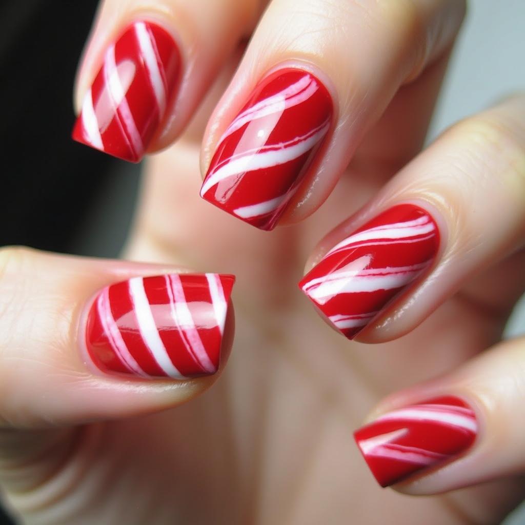 Candy cane stripes in red and white are a timeless Christmas design. Combine this with a frosty white base for a fresh winter vibe, and your nails will capture the spirit of the season perfectly.