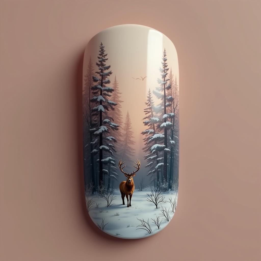 Create a serene winter forest scene with delicate white snowflakes, frosted trees, and a small deer silhouette. This design combines the beauty of winter with a magical holiday theme, perfect for a peaceful yet festive look.