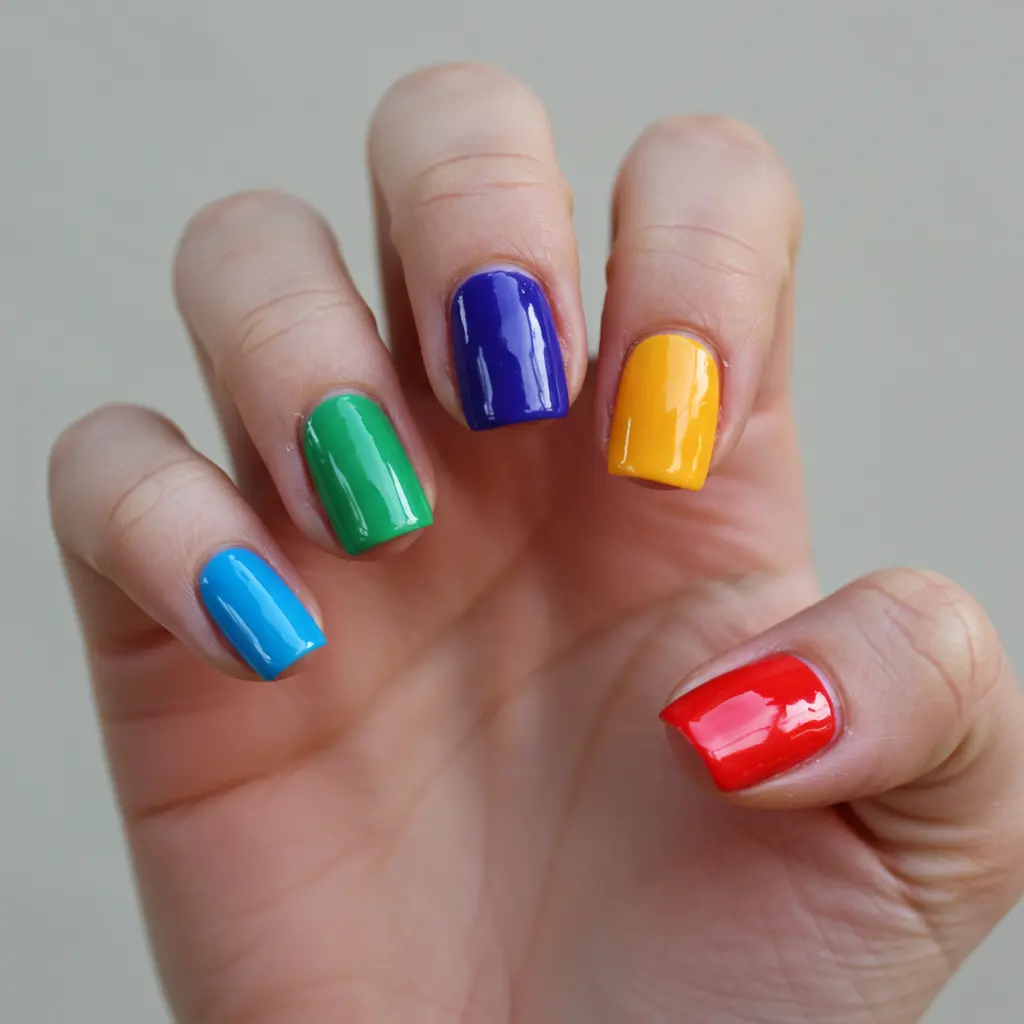 Detailed Look & Feel: Each nail painted a different solid color of the rainbow (or a selection of bright hues). Simple, cheerful, and endlessly customizable.