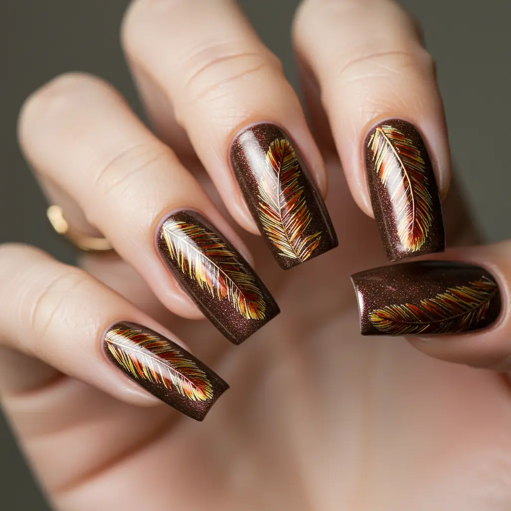 Customization Tips: “Mention wanting gold or copper metallic highlights within the feather design,” or “Ask for a single, beautifully detailed feather on each accent nail against a deep fall color.”