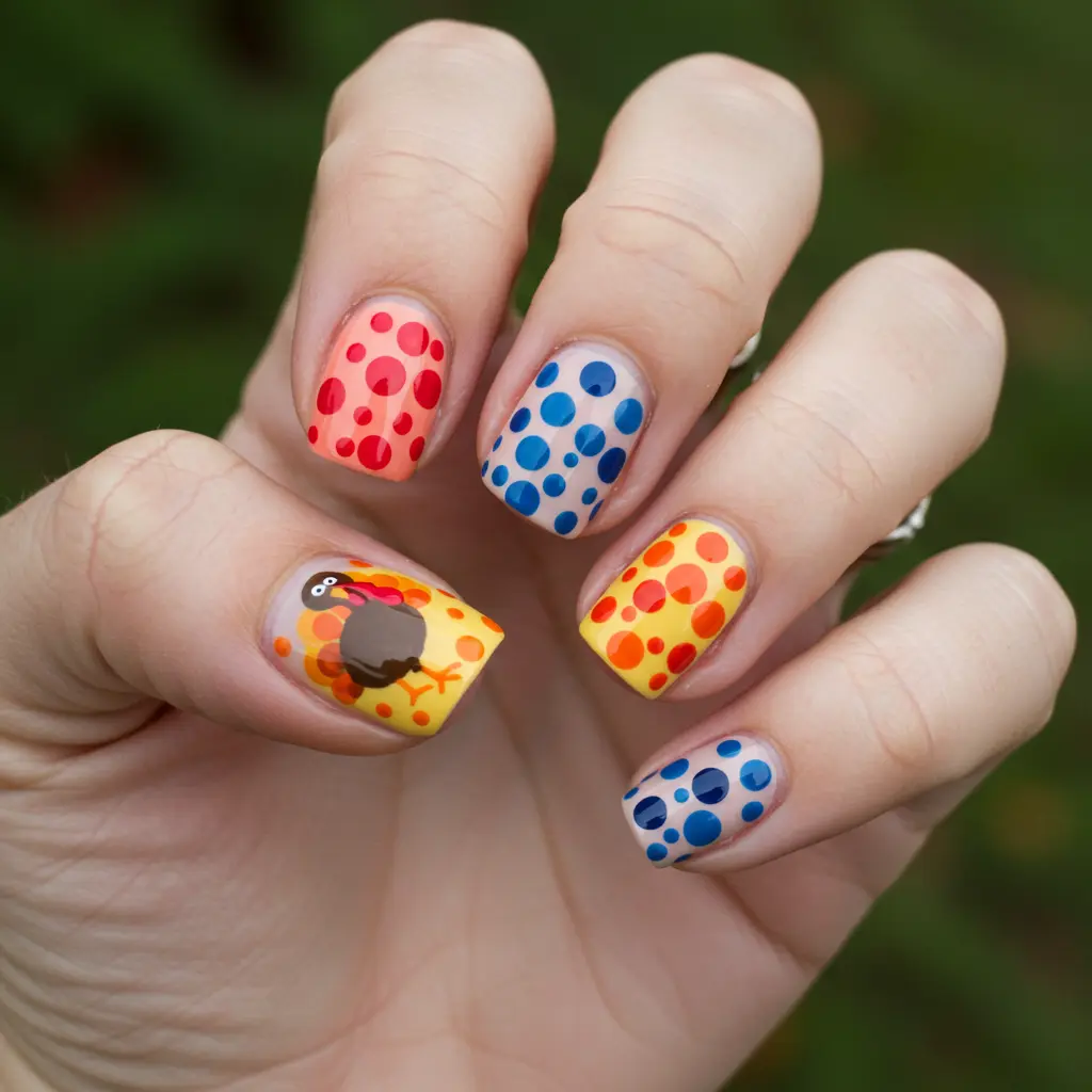 Detailed Look & Feel: Each nail painted a different, coordinating fall color (e.g., burgundy, mustard, olive, brown, cream), with one nail featuring an adorable, standout turkey design.