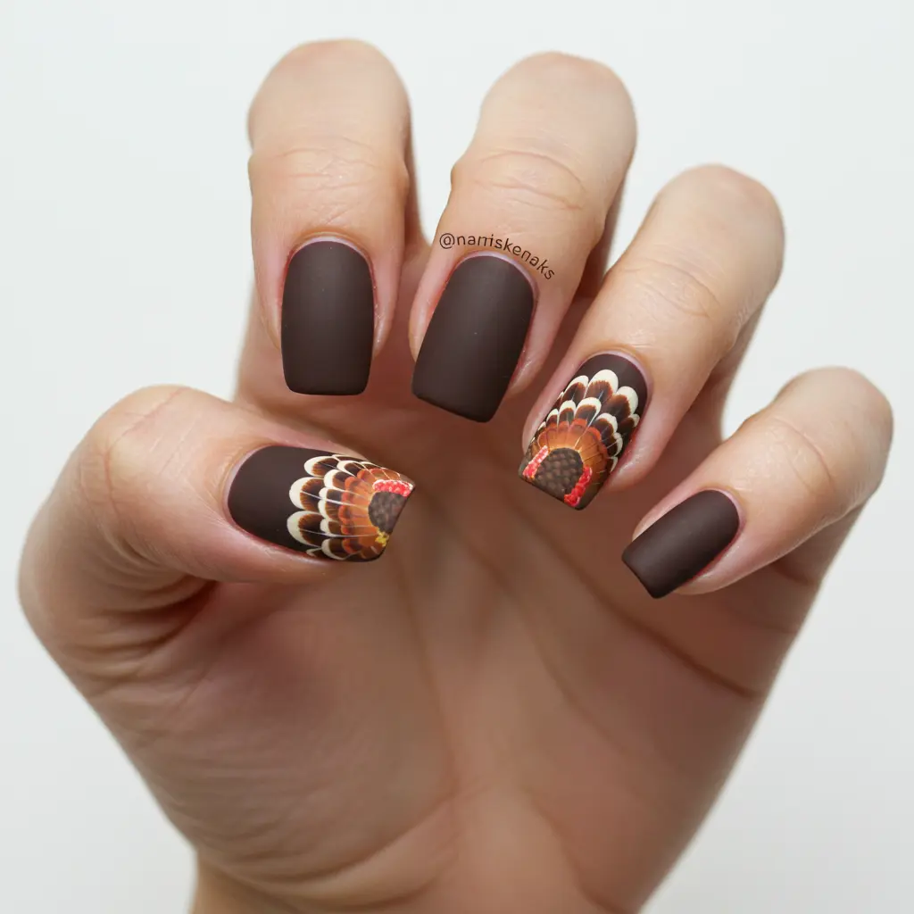 Customization Tips: “Request a single turkey silhouette in matte black on a glossy nude nail,” or “Ask for a gold metallic silhouette for a touch of glam.”