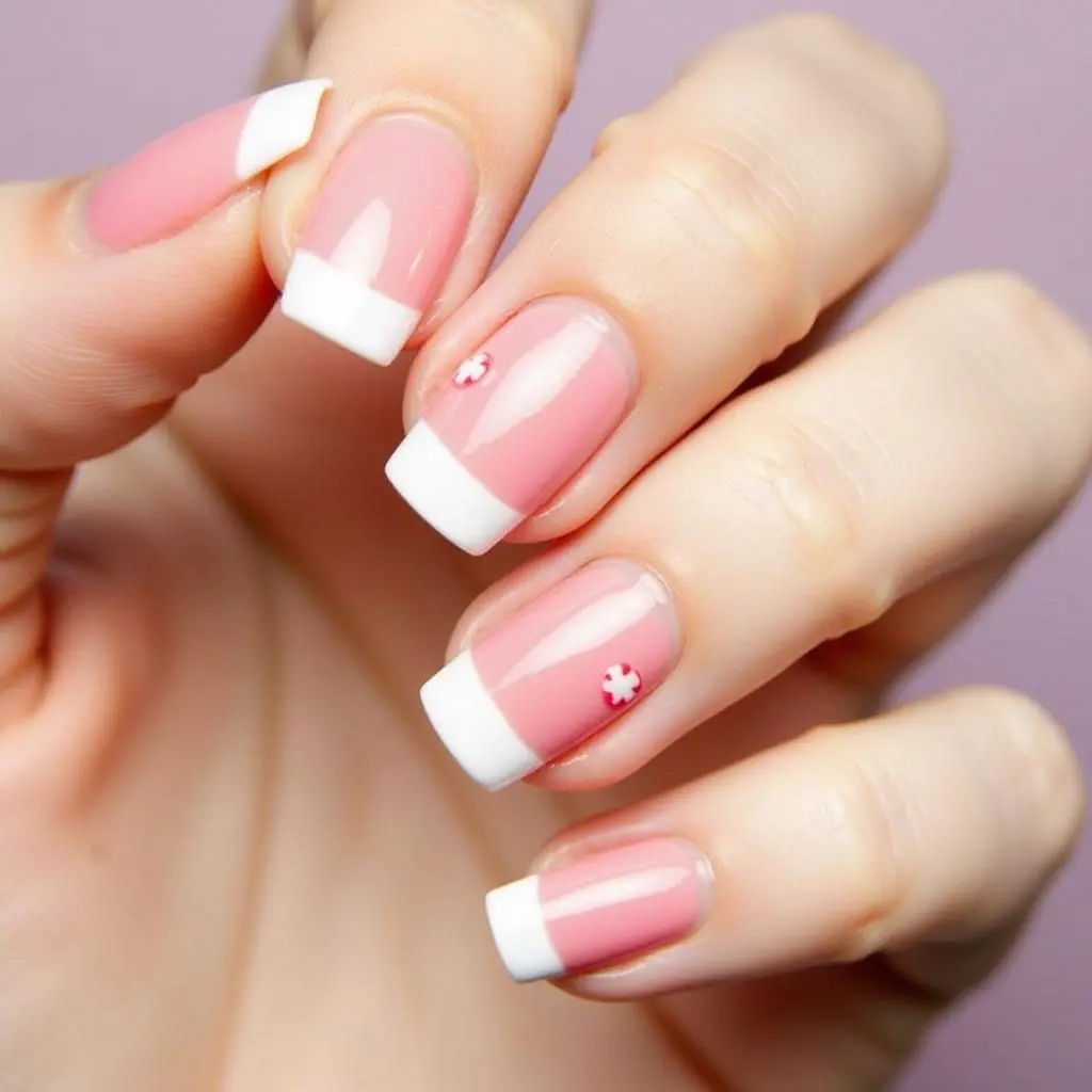 Add tiny pink hearts at the tips for a sweet and whimsical touch to your French manicure.