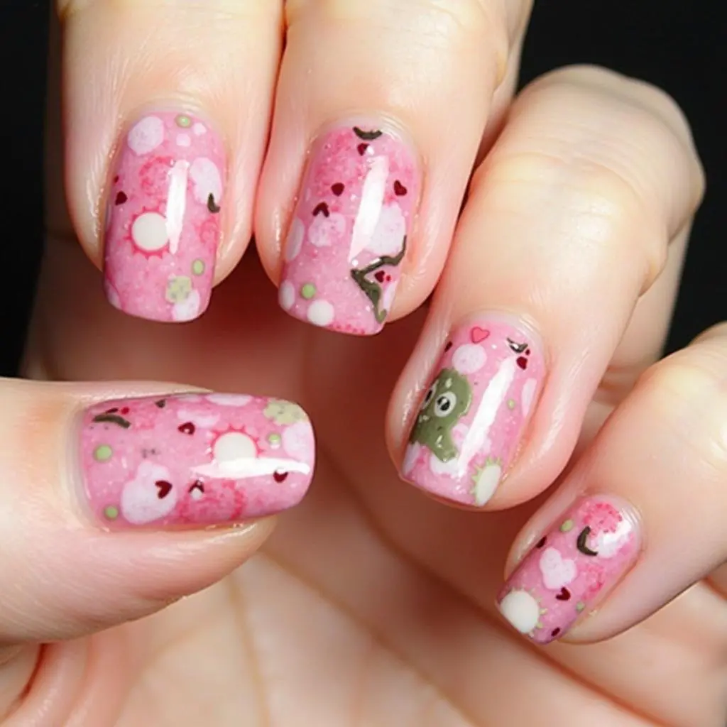 Choose a few accent nails to paint with gummy bears, while the rest of your nails are a solid pink or red.